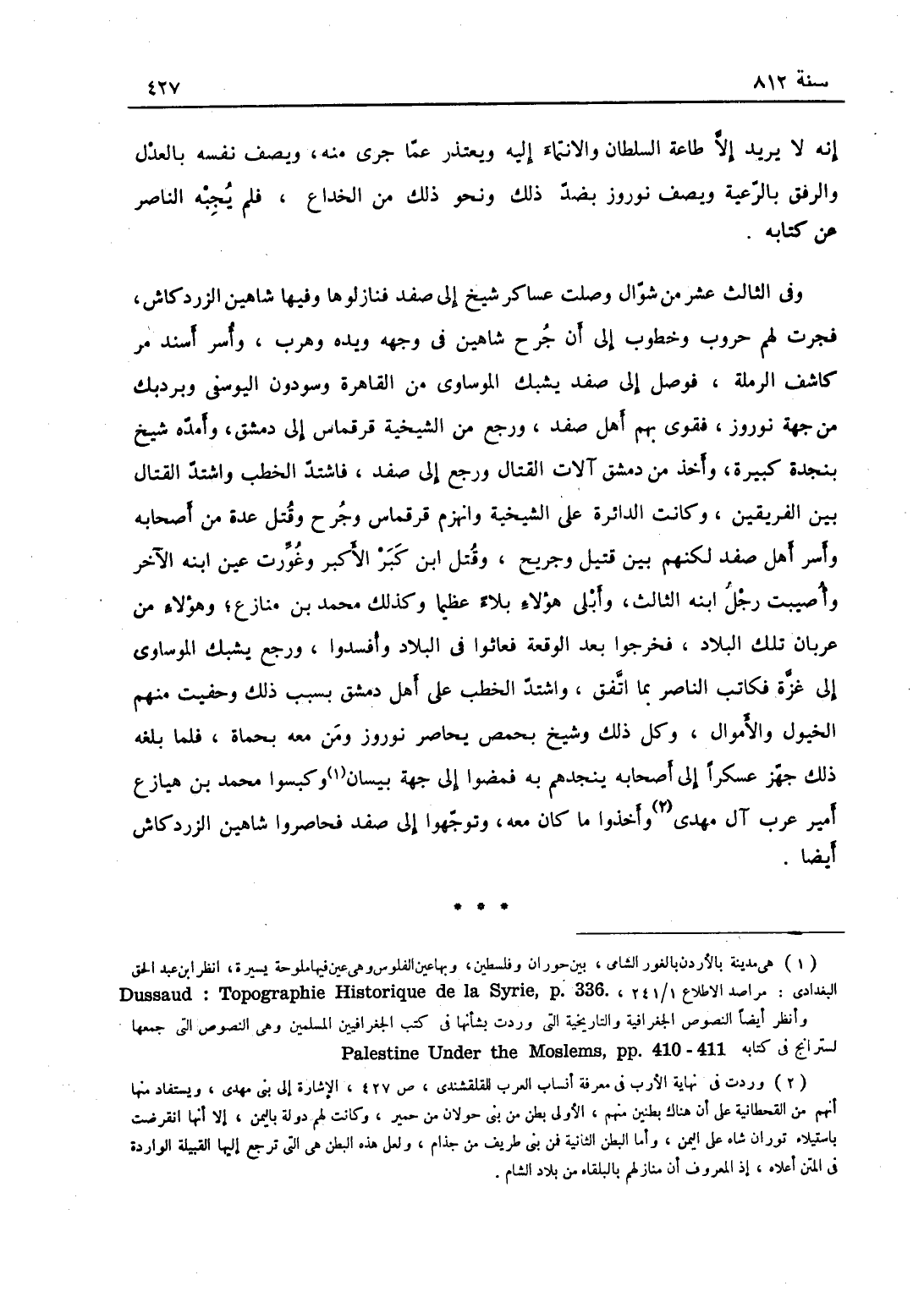 وفي الثالث عشر من شوال وصلت عساكر شيخ إلى صفد فنازلوها وفيها شاهين الزردكاش فجرت لهم حروب وخطوب إلى أن جرح شاهين في وجهه ويده وهرب وأسر أسندمر كاشف الرملة فوصل إلى صفد يشبك الموساوي من القاهرة، وسودون اليوسفي وبردبك من جهة نوروز، فقوي بهم أهل صفد، فرجع من الشيخية قرقماش إلى دمشق، وأمده شيخ بنجدة كبيرة، وأخذ من دمشق آلات القتال، ورجع إلى صفد، فاشتد الخطب واشتد القتال بين الفريقين، وكانت الدائرة على الشيخية، وانهزم قرقماش وجرح وقتل عدة من أصحابه، وأسر أهل صفد لكنهم بين قتيل وجريح، وقتل ابن مهنا الأكبر وعورت عين ابنه الآخر، وأصيبت رجل ابنه الثالث وأبلى هو بلاء عظيماً، وكذلك محمّد بن هيازع، وهؤلاء عربان تلك البلاد فخرجوا بعد الوقعة فعاثوا في البلاد وأفسدوا، ورجع يشبك الموساوي إلى غزة، فكاتب الناصر بما اتفق، واشتد الخطب على أهل دمشق بسبب ذلك، وجبيت منهم الخيول والأموال، وكل ذلك وشيخ بحمص يحاصر نوروز ومن معه بحماة، فلما بلغه ذلك جهز عسكراً إلى أصحابه يمدهم به، فمضوا إلى نيسان وكبسوا محمّد بن هيازع أمير عرب آل مهدي، وأخذوا ما كان معه، وتوجهوا إلى صفد فحاصروا شاهين الزردكاش أيضاً.
