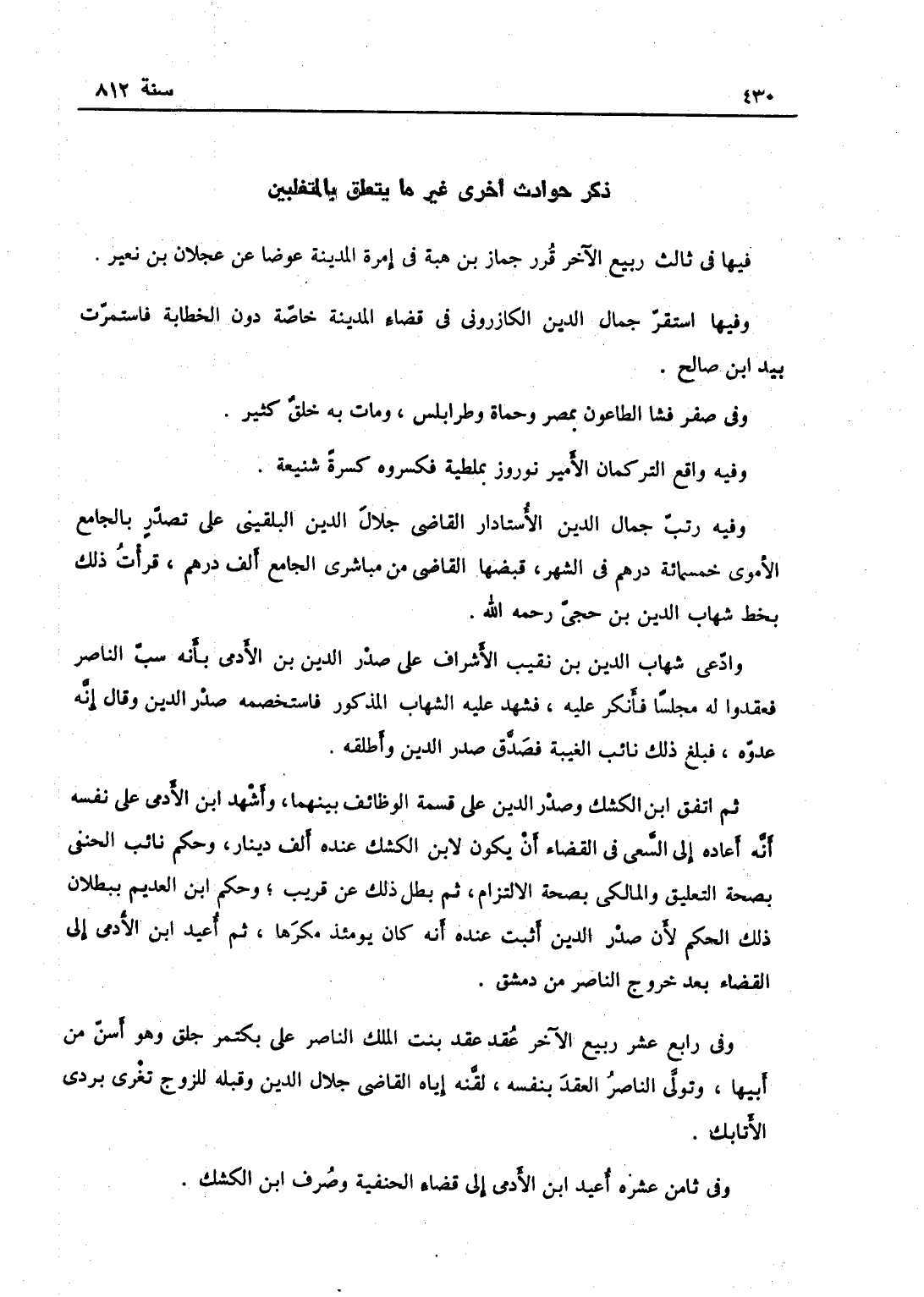 وفيه رتب جمال الدين الأستادار للقاضي جلال الدين البلقيني على تصدر بالجامع الأموي خمسمائة درهم في الشهر يقبضها من مباشري الجامع ألف درهم قرأت ذلك بخط القاضي شهاب الدين ابن حجي رحمه الله.