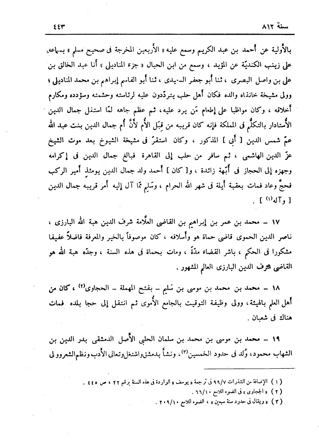 بالأولية من أحمد بن عبد الكريم، وسمع عليه الأربعين المخرجة من صحيح مسلم بسماعه على زينب الكندية عن المؤبد، وسمع من ابن الحبال جزء المناديلي، أنا عبد الخالق بن علي بن واصل البصري ثنا أبو جعفر السعيدي ثنا أبو القاسم إبراهيم بن محمّد المناديلي، وولي مشيخة خانقاه والده فكان أهل حلب يترددون غليه لرياسته وحشمته وسؤدده، ومكارم أخلاقه، وكان مواظباً على إطعام من يرد عليه ثم عظم جاهه لما استقر جمال الدين الأستادار في التكلم في المملكة فإنه كان قريبه من قبل الأم لأن أم جمال الدين بنت عبد الله عم شمس الدين المذكور وكان استقر في مشيخة الشيوخ بعد موت الشيخ عز الدين الهاشمي، ثم سافر من حلب إلى القاهرة فبالغ جمال الدين في إكرامه وجهزه إلى الحجاز في أبهة زائدة وأحمد ولد جمال الدين يومئذٍ أمير الركب فحج وعاد فمات بعقبة أيلة في شهر الله المحرم، وسلم مما آل إليه أمر قريبه جمال الدين وآله.
