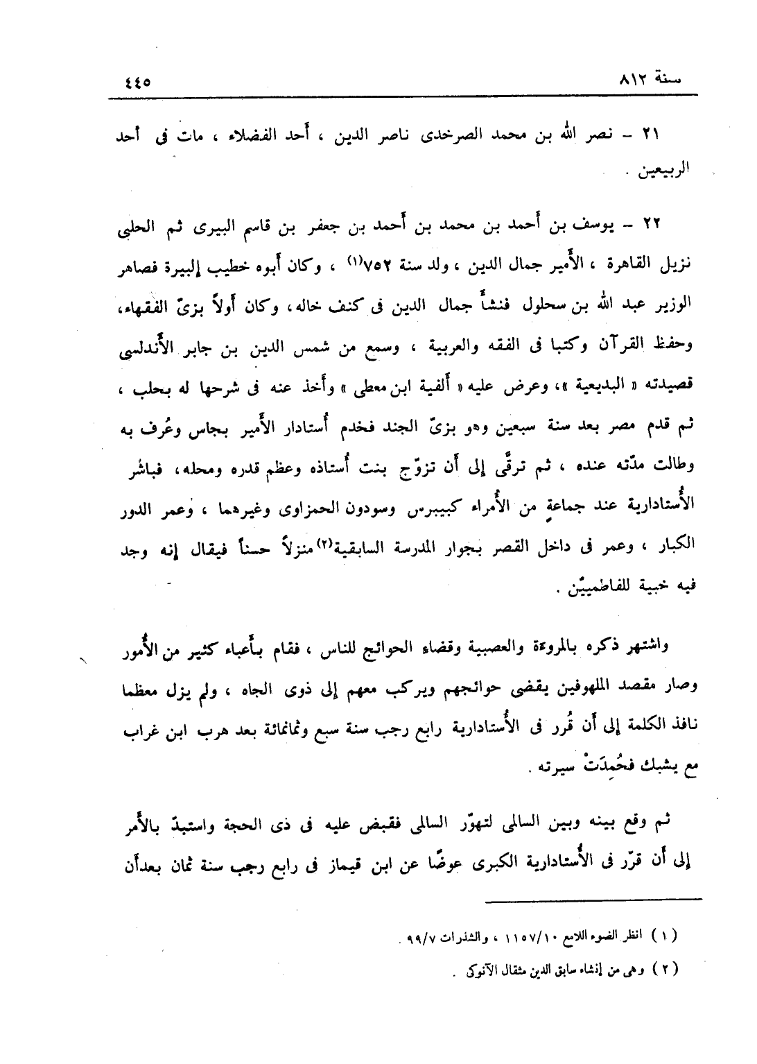 يوسف بن أحمد بن محمّد بن أحمد بن جعفر بن قاسم البيري، ثم الحلبي نزيل القاهرة الأمير جمال الدين، ولد سنة 752 وكان أبوه خطيب البيرة فصاهر الوزير شمس الدين بن سحلول فنشأ جمال الدين في كنف خاله وكان أولاً بزي الفقهاء وحفظ القرآن وكتباً في الفقه والعربية، وسمع من شمس الدين ابن جابر الأندلسي قصيدته البديعية. وعرض عليه ألفية ابن معطي وأخذ عنه في شرحها له بحلب، ثم قدم مصر بعد سنة سبعين وهو بزي الجند فخدم أستادار الأمير بجاس وعرف به وطالت مدته عنده، ثم ترقى إلى أن تزوج بنت أستاذه وعظم قدره ومحله، فباشر الأستادراية عند جماعة من الأمراء كبيبرس وسودون الحمزاوي وغيرهما، وعمر الدور الكبار وعمر في داخل القصر بجوار المدرسة السابقية منزلاً حسناً، فيقال إنه وجد فيه خبيئة للفاطميين واشتهر ذكره بالمروءة والعصبية وقضاء حوائج الناس فقام بإعباء كثير من الأمور وصار مقتصداً للملهوفين يقضي حوائجهم ويركب معهم إلى ذوي الجاه، ولم يزل معظماً نافذ الكلمة إلى أن قرر في الأستادارية رابع رجب سنة سبع وثمانمائة بعد أن هرب ابن غراب مع يشبك فشكرت سيرته، ثم وقع بينه وبين السالمي لتهور السالمي فقبض عليه في ذي الحجة واستبد بالأمر إلى أن قرر في الأستادارية الكبرى عوضاً عن ابن قيماز في رابع رجب سنة ثمان بعد أن