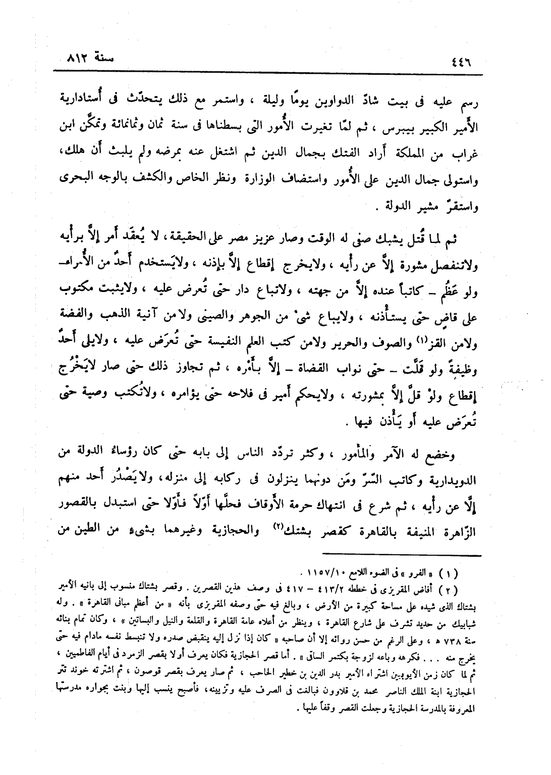 رسم عليه في بيت شاد الدواوين يوماً وليلة واستمر مع ذلك يتحدث في أستادارية الأمير الكبير بيبرس، ثم لما تغيرت الأمور التي بسطناها في سنة ثمان وثمانمائة وتمكن ابن غراب من المملكة أراد الفتك بجمال الدين، ثم اشتغل عنه بمرضه ولم يلبث أن هلك، فاستولى جمال الدين على الأمور واستضاف الوزارة ونظر الخاص والكشف بالوجه البحري واستقر مشير الدولة، ثم لما قتل يشبك صفا الوقت له وصار عزيز مصر على الحقيقة، لا يعقد أمر إلا به ولا تفصل مشورة إلا عن رأيه، ولا تخرج إقطاع إلا بإذنه، ولا يستخدم أحد من الأمراء ولو عظم كاتباً عنده إلا من جهته، ولا تباع دار حتى تعرض عليه، ولا يكتب مكتوب على قاض حتى يستأذنه، ولا يباع شيء من الجوهر والصيني ولا من آنية الذهب والفضة ولا من الفرو والصوف والحرير ولا من كتب العلم النفيسة حتى يعرض عليه، ولا يلي أحد وظيفة ولو قلت حتى نواب القضاة إلا بأمره، ثم تجاوز ذلك حتى صار لا يخرج إقطاع ولو قل إلا بمشورته ولا يحكم أمير في فلاحه حتى يؤامره، ولا تكتب وصية حتى تعرض عليه أو يأذن فيها، وخضع له الآمر والمأمور، وكثر تردد الناس إلى بابه حتى كان رؤساء الدولة من الدويدارية وكاتب السر ومن دونهما ينزلون في ركابه إلى منزله، ولا يصدر أحد منهم إلا عن رأيه، ثم شرع في انتهاك حرمة الأوقاف فحلها أولاً فأولاً حتى استبدل بالقصور الزاهرة المنيفة بالقاهرة كقصر يشبك والحجارية وغيرهما بشيء من الطين من