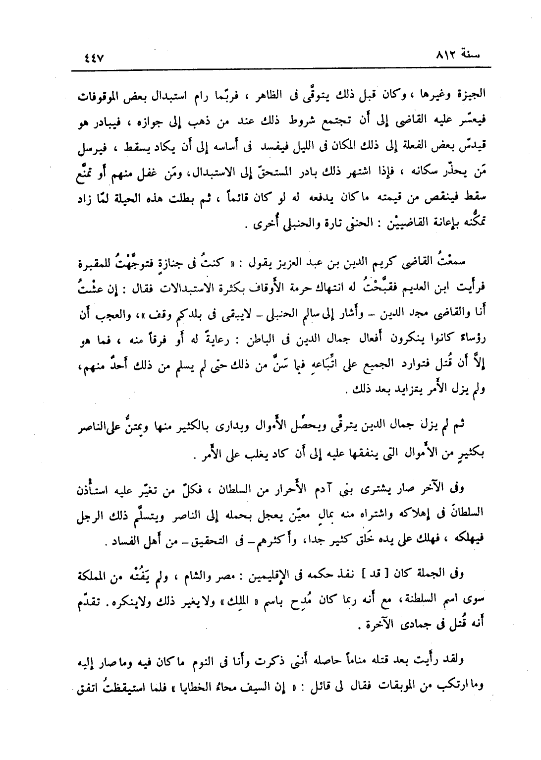 وفي الجملة كان قد نفذ حكمه في الإقليمين مصر والشام، ولم يفته من المملكة سوى اسم السلطنة مع أنه كان ربما مدح باسم الملك ولا يغير ذلك ولا ينكره، وتقدم أنه قتل في جمادى الآخرة، ولقد رأيت له بعد قتله مناماً صالحاً حاصله أني ذكرت وأنا في النوم ما كان فيه وما صار إليه وما ارتكب من الموبقات، فقال لي قائل: إن السيف محاء للخطايا، فلما استيقظت اتفق