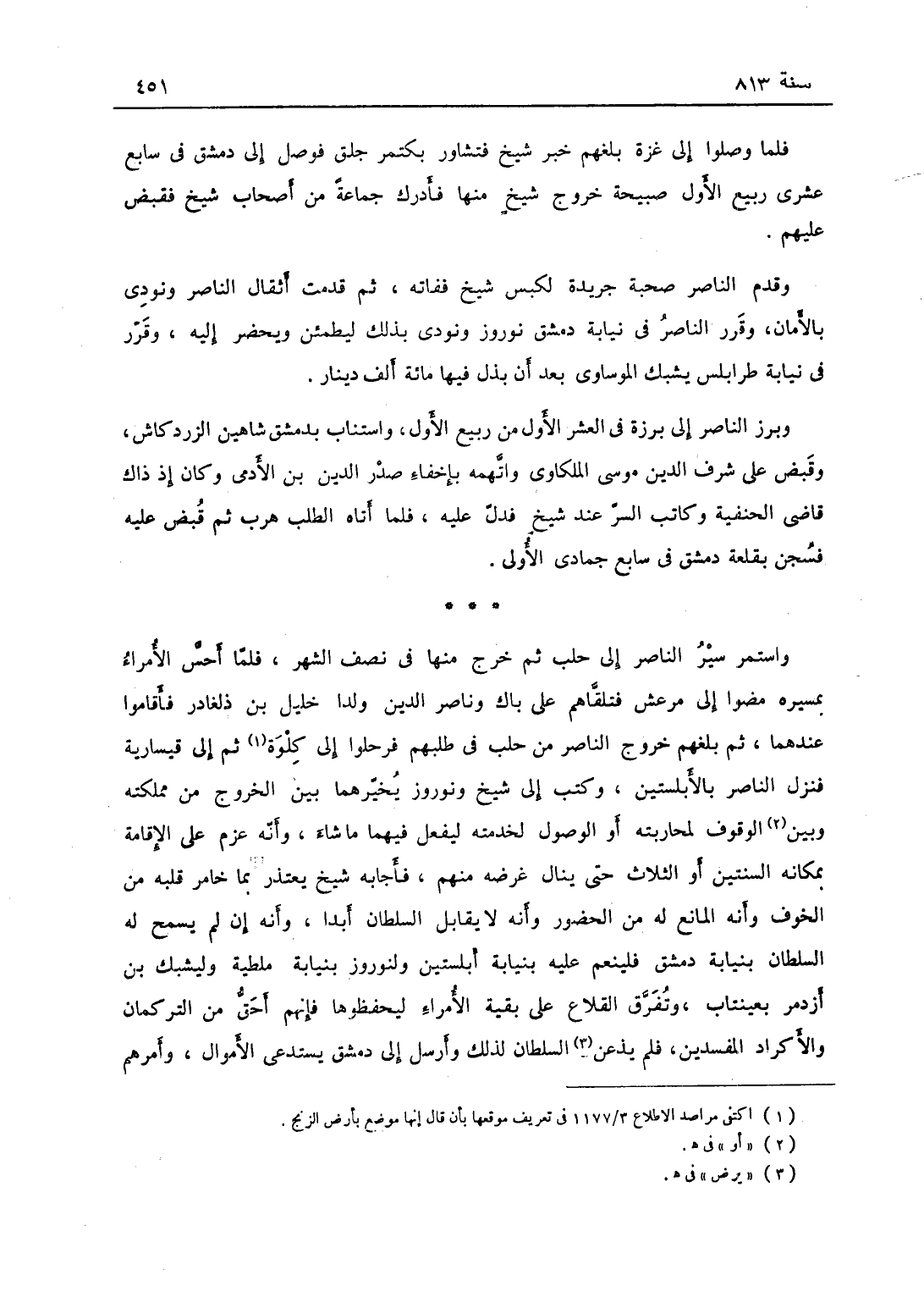 فلما وصلوا إلى غزة بلغهم خبر شيخ فبادر بكتمر جلق فأسرع السير فوصل إلى دمشق في سابع عشري ربيع الأول صبيحة خروج شيخ منها فأدرك جماعة من أصحاب شيخ فقبض عليهم، وقدم الناصر صبيحة ذلك جريدة ليكبس شيخ ففاته، ثم قدمت أثقال الناصر ونودي بالأمان وقرر الناصر في نيابة دمشق نوروز ونودي بذلك ليطمئن ويحضر إليه، وقرر في نيابة طرابلس يشبك الموساوي بعد أن بذل فيها مائة ألف دينار. وبرز الناصر إلى برزة في العشر الأول من ربيع الأول واستناب بدمشق شاهين الزردكاش وقبض على شرف الدين موسى الملكاوي واتهمه بإخفاء صدر الدين ابن الأدمي وكان إذ ذاك قاضي الحنفية وكاتب السر عند شيخ فدلّ عليه، فلما أتاه الطلب هرب ثم قبض عليه فسجن بقلعة دمشق في سابع جمادى الأولى واستمر مسير الناصر إلى حلب ثم خرج منها في نصف الشهر، فلما أحسّ الأمراء بمسيره مضوا إلى مرعش فتلقاهم علي بك وناصر الدين بك ولدا خليل بن بلغادر فأقاموا عندهما، ثم بلغهم خروج الناصر من حلب في طلبهم فرحلوا إلى غلوا ثم إلى قيسارية فنزل الناصر بالابلستين وكتب إلى شيخ ونوروز يخيّرهما بين الخروج عن مملكته أو الوقوف لمحاربته أو الوصول إلى خدمته ليفعل فيهما ما شاء وأنه عزم على الإقامة بمكانه السنتين والثلاث حتى ينال غرضه منهم، فأجابه شيخ يعتذر بما خامر قلبه من الخوف وأنه المانع من الحضور وأنه لا يقابل السلطان أبداً وأنه إن لم يسمح له السلطان بنيابة دمشق فلينعم عليه بنيابة أبلستين ولنوروز بنيابة ملطية وليشبك بن أزدمر بعينتاب ويفرق القلاع على بقية الأمراء ليحفظوها فإنهم أحق من التركمان والأكراد المفسدين، فلم يرض السلطان بذلك وأرسل إلى دمشق يستدعي الأموال وأمرهم