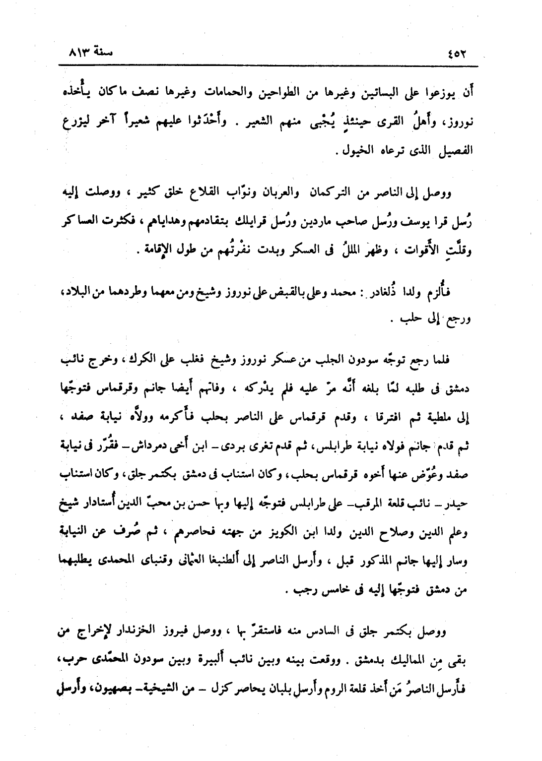 أن يوزعوا البساتين وغيرها من الطواحين والحمامات وغيرها نصف ما كان يأخذه نوروز، وأهل القرى حينئذ يجبى منهم الشعير وأحدثوا عليهم شعيراً آخر ليزرع للفصيل التي ترعاه الخيل. ووصل إلى الناصر من التركمان والعربان ونواب القلاع خلق كثير، ووصلت إليه رسل قرا يوسف ورسل صاحب ماردين ورسل قرا يلك بتقادمهم وهداياهم، فكثرت العساكر وقلت الأقوات وظهر الملل في العسكر وبدت نفرتهم من طول الإقامة فألزم ولدا دلغادر محمّد بك وعلي بك بالقبض على نوروز وشيخ ومن معهما وطردهما من البلاد ورجع إلى حلب، فلما رجع توجه سودون الجلب من عسكر نوروز وشيخ فغلب على الكرك، وخرج نائب دمشق في طلبه فلما بلغه أنه مر عليه فلم يدركه وفاتهم أيضاً جانم وقرقماش فتوجها إلى ملطية ثم افترقا فقدم قرقماش على الناصر بحلب فأكرمه وولاه نيابة صفد، ثم قدم جانم فولاه نيابة طرابلس، ثم قدم تغرى بردى ابن أخي دمرداش فقرر في نيابة صفد وعوض عنها أخوه قرقماش بحلب وكان استناب في دمشق