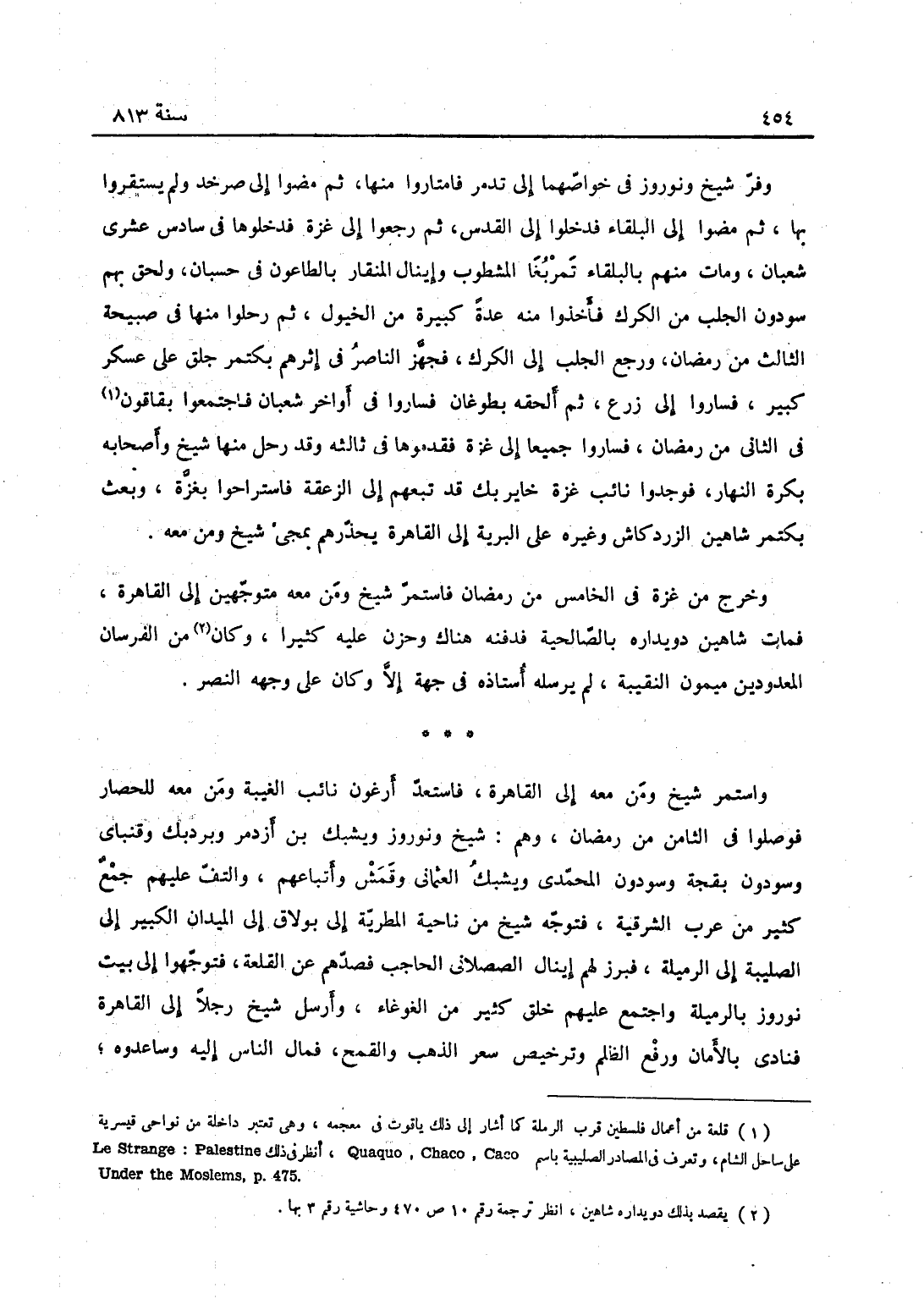ومر شيخ ونوروز في خواصهما إلى تدمر فامتاروا منها ثم مضوا إلى صرخد ولم يستقروا بها ثم مضوا إلى البلقاء ودخلوا إلى القدس، ثم رجعوا إلى غزة فدخلوها في سادس عشري شعبان ومات منهم بالبلقاء تمربغا المشطوب وإينال المنقار بالطاعون في حسبان ولحق بهم سودون الجلب من الكرك فاخذوا من غزة كثيراً من الخيول ثم رحلوا منها في صبيحة الثالث من رمضان ورجع الجلب إلى الكرك فجهز الناصر في أثرهم بكتمر جلق على عسكر كثير، فسار إلى زرع ثم ألحقه بطوغان، فساروا في أواخر شعبان فاجتمعوا بقاقون في الثاني من رمضان فساروا جميعاً إلى غزة فقدموها في ثالثه، وقد رحل منها شيخ وأصحابه بكرة النهار فوجدوا نائب غزة جاني بك قد تبعهم إلى الزعقة فاستراحوا بغزة وبعث بكتمر شاهين الزردكاش وغيره على البرية إلى القاهرة يحذرهم مجيء شيخ ومن معه وخرج من غزة في الخامس من رمضان واستمر شيخ ومن معه متوجهين إلى القاهرة فمات شاهين دويداره بالصالحية، فدفنه هناك، وحزن عليه كثيراً وكان من الفرسان المعدودين ميمون النقيبة لم يرسله أستاذه في جهة إلا وكان على وجهه النصر واستمر شيخ ومن معه إلى القاهرة، فاستعد أرغون نائب الغيبة ومن معه للحصار، فوصلوا في الثامن من رمضان وهم شيخ ونوروز ويشبك بن أزدمر وبردبك وقنباي وسودون بقجة وسودون المحمدي ويشبك العثماني وقمش وأتباعهم، والتف عليهم جمع كثير من عرب الشرقية فتوجه شيخ من ناحية المطرية إلى بولاق إلى الميدان الكبير إلى الصليبة إلى الرملة فبرز لهم أينال الصصلاني الحاجب فصدهم عن القلعة فتوجهوا إلى بيت نوروز بالرملة واجتمع عليهم خلق كثير من الغوغاء وأرسل شيخ رجلاّ إلى القاهرة فنادى بالأمان ورفع الظلم ورخص سعر الذهب والقمح، فمال الناس إليه وساعدوه