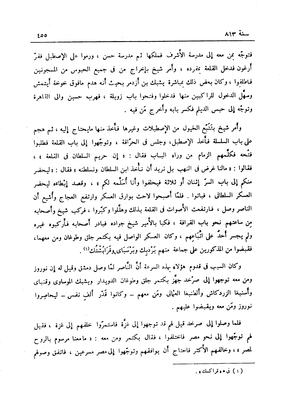 اتباعهم وكان العسكر الواصل فيه بكتمر جلق وطوغان ومن معهما فقبضوا من المذكورين على جماعة منهم بردبك وبرسباي وقراكشك وكان السبب في قدوم هؤلاء بهذه السرعة أن الناصر لما وصل دمشق وقيل له إن نوروز ومن معه توجهوا إلى صرخد جهز بكتمر جلق وطوغان الدويدار ويشبك الموساوي وقنباي واسنبغا الزردكاش والطنبغا العثماني ومن معهم وكانوا قدر ألف نفس ليحاصروا نوروز ومن معه، ويقبضوا عليهم فلما وصلوا إلى صرخد قيل لهم قد توجهوا إلى غزة فاستمروا خلفهم إلى غزة فقيل لهم توجهوا نحو مصر، فاختلفوا فقال بكتمر ومن معه: ما معنا مرسوم بالرواح لمصر، وخالفهم الأكثر فاحتاج أن يوافقهم وتوجهوا إلى مصر مسرعين فاتفق وصولهم حين أراد نائب الغيبة بالقلعة أن يسلم القلعة فبطل ذلك فجأة، وظن شيخ ومن معه أن السلطان في العسكر المذكور فانهزموا، ولو تحقق أن رأسهم بكتمر لما انهزم لعلمه أن بكتمر المذكور لا يقوم قدامه، واعتذر من قدم من عدم اتباعهم للمنهزمين أن خيولهم كانت أعيت، وكذلك الرجال من توالي الركض حتى أدركوا ما أدركوا، فسار شيخ بمن معه إلى إطفيح ثم إلى السويس، فأخذوا منها عليقاً وجمالاً، وسار بهم شعبان بن عيسى في درب الحاج إلى نخل وافترقوا حينئذ فرقتين: فرقة رأسها نوروز ومعه يشبك بن أزدمر وسودون بقجة، وفرقة فيها شيخ ومعه سودون قراصقل وسودون المحمدي، فوصلوا إلى الشوبك ثم إلى الكرك فتلقاهم سودون الجلب وأدخلهم المدينة، فلما كان في وسط ذي القعدة توجه شيخ إلى الحمام بالكرك ومعه قنباي المحمدي وسودون وطائفة يسيرة، فبادر أحمد بن أبي العباس الحاجب بالكرك وأراد الفتك به ومعه جمع كثير فاقتحموا الحمام فسبقهم بعض مماليك شيخ فأعلمه، فنهض وفي وسطه مئزره وفي يده طاسة الحمام فقاتلهم فأخرجهم من الحمام، ثم تكاثروا عليه فأدركه نوروز في جماعة فكسرهم، وقد أصاب شيخ سهم فخرج منه بسببه دم كثير فسقط مغشياً عليه، فحمل على بساطه وأقام أياماً لا يعقل، وقتل في هذه الكائنة سودون بقجة وكان شاباً وكان زوج بنت تمراز وكان مع ذلك محبّاً في العلماء، فلما وقع ذلك خشي سودون الجلب من الأمراء أن ينسبوه إلى الفتنة المذكورة، فهرب منهم إلى ماردين وعزم على المضي إلى قرا يوسف، فبلغه أنه مشغول بمحاربة ملوك الترك مثل إيدكي وإبراهيم الدربندي وشاه رخ بن تمرلنك، فتأخر عن المضي إليه ونودي بالقاهرة بتهديد من آوى أحدا من الشيخية والنوروزية، وبسط حسام الدين الوالي في أذى من ينسب إليهم حتى منعه بعد ذلك نائب الغيبة، وأخذ بكتمر جلق من الأستادار السلطاني ألف دينار وألزم المحتسب ببيع قمح له بألفي دينار وإحضار ثمنها، فعجز عن ذلك وهرب وعزل نفسه، وهو شمس الدين بن الدميري ومات بعد قليل في رمضان وأخذ بكتمر من تجار الشام مالا جزيلا قرضاً، وتوجه في السادس عشر يريد دمشق، فوصل إلى غزة في الثاني والعشرين منه. اعهم وكان العسكر الواصل فيه بكتمر جلق وطوغان ومن معهما فقبضوا من المذكورين على جماعة منهم بردبك وبرسباي وقراكشك وكان السبب في قدوم هؤلاء بهذه السرعة أن الناصر لما وصل دمشق وقيل له إن نوروز ومن معه توجهوا إلى صرخد جهز بكتمر جلق وطوغان الدويدار ويشبك الموساوي وقنباي واسنبغا الزردكاش والطنبغا العثماني ومن معهم وكانوا قدر ألف نفس ليحاصروا نوروز ومن معه، ويقبضوا عليهم فلما وصلوا إلى صرخد قيل لهم قد توجهوا إلى غزة فاستمروا خلفهم إلى غزة فقيل لهم توجهوا نحو مصر، فاختلفوا فقال بكتمر ومن معه: ما معنا مرسوم بالرواح لمصر، وخالفهم الأكثر فاحتاج أن يوافقهم وتوجهوا إلى مصر مسرعين فاتفق وصولهم