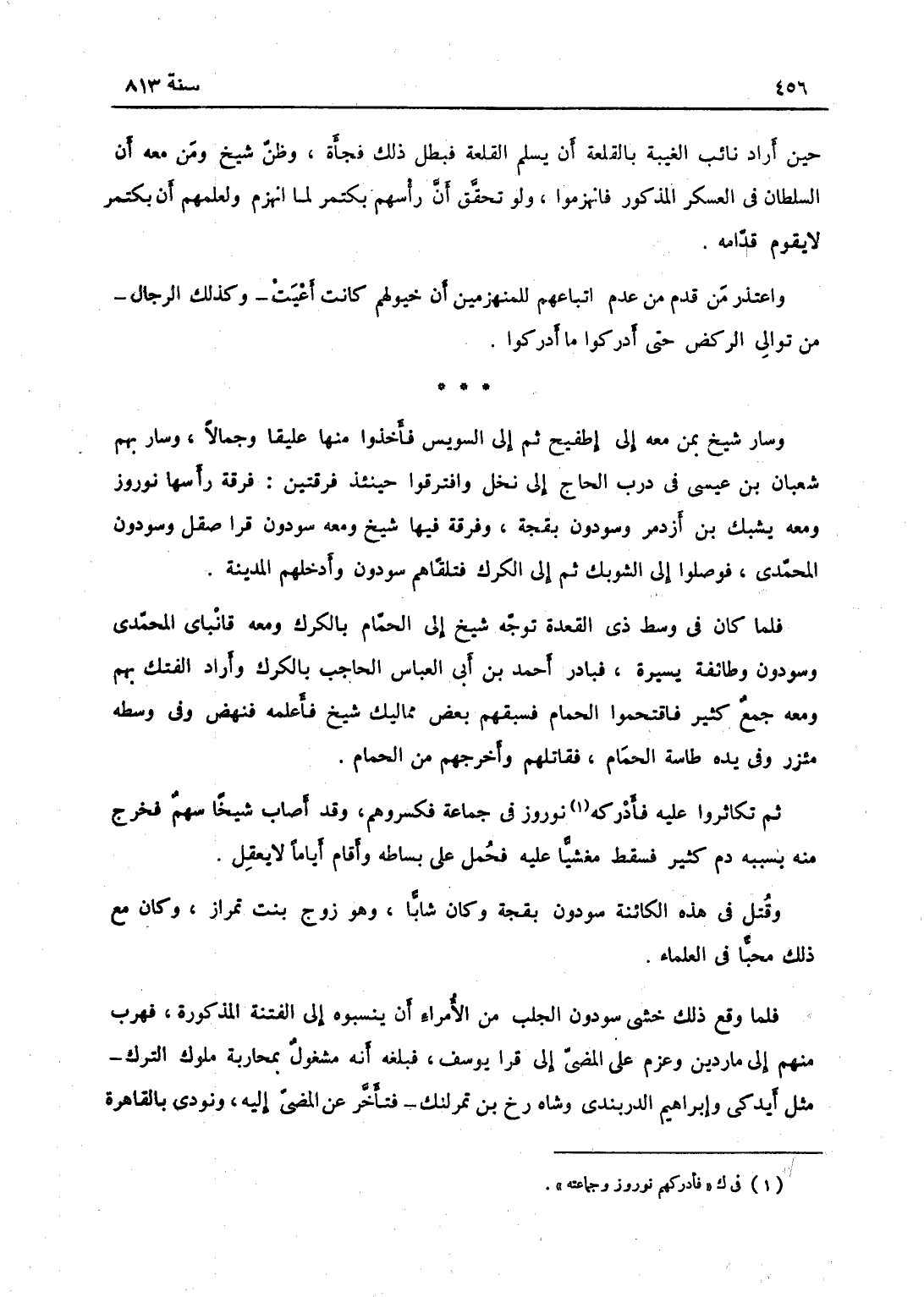 حين أراد نائب الغيبة بالقلعة أن يسلم القلعة فبطل ذلك فجأة، وظن شيخ ومن معه أن السلطان في العسكر المذكور فانهزموا، ولو تحقق أن رأسهم بكتمر لما انهزم لعلمه أن بكتمر المذكور لا يقوم قدامه، واعتذر من قدم من عدم اتباعهم للمنهزمين أن خيولهم كانت أعيت، وكذلك الرجال من توالي الركض حتى أدركوا ما أدركوا، فسار شيخ بمن معه إلى إطفيح ثم إلى السويس، فأخذوا منها عليقاً وجمالاً، وسار بهم شعبان بن عيسى في درب الحاج إلى نخل وافترقوا حينئذ فرقتين: فرقة رأسها نوروز ومعه يشبك بن أزدمر وسودون بقجة، وفرقة فيها شيخ ومعه سودون قراصقل وسودون المحمدي، فوصلوا إلى الشوبك ثم إلى الكرك فتلقاهم سودون الجلب وأدخلهم المدينة، فلما كان في وسط ذي القعدة توجه شيخ إلى الحمام بالكرك ومعه قنباي المحمدي وسودون وطائفة يسيرة، فبادر أحمد بن أبي العباس الحاجب بالكرك وأراد الفتك به ومعه جمع كثير فاقتحموا الحمام فسبقهم بعض مماليك شيخ فأعلمه، فنهض وفي وسطه مئزره وفي يده طاسة الحمام فقاتلهم فأخرجهم من الحمام، ثم تكاثروا عليه فأدركه نوروز في جماعة فكسرهم، وقد أصاب شيخ سهم فخرج منه بسببه دم كثير فسقط مغشياً عليه، فحمل على بساطه وأقام أياماً لا يعقل، وقتل في هذه الكائنة سودون بقجة وكان شاباً وكان زوج بنت تمراز وكان مع ذلك محبّاً في العلماء، فلما وقع ذلك خشي سودون الجلب من الأمراء أن ينسبوه إلى الفتنة المذكورة، فهرب منهم إلى ماردين وعزم على المضي إلى قرا يوسف، فبلغه أنه مشغول بمحاربة ملوك الترك مثل إيدكي وإبراهيم الدربندي وشاه رخ بن تمرلنك، فتأخر عن المضي إليه ونودي بالقاهرة