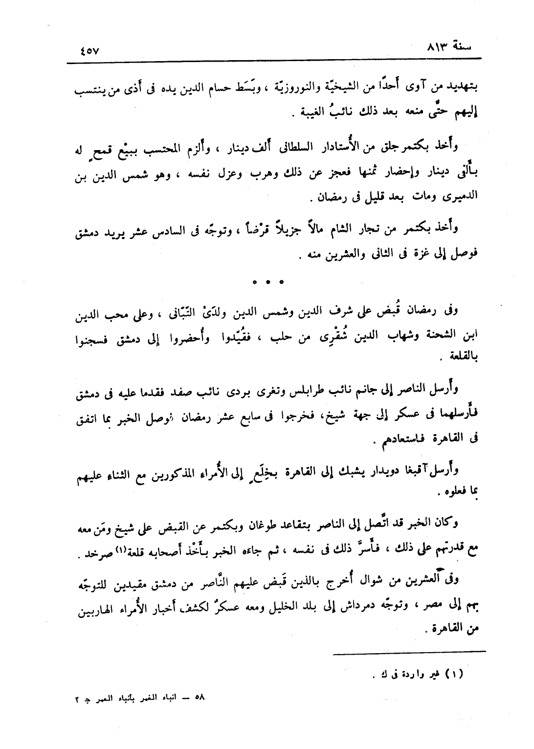 بتهديد من آوى أحدا من الشيخية والنوروزية، وبسط حسام الدين الوالي في أذى من ينسب إليهم حتى منعه بعد ذلك نائب الغيبة، وأخذ بكتمر جلق من الأستادار السلطاني ألف دينار وألزم المحتسب ببيع قمح له بألفي دينار وإحضار ثمنها، فعجز عن ذلك وهرب وعزل نفسه، وهو شمس الدين بن الدميري ومات بعد قليل في رمضان وأخذ بكتمر من تجار الشام مالا جزيلا قرضاً، وتوجه في السادس عشر يريد دمشق، فوصل إلى غزة في الثاني والعشرين منه.