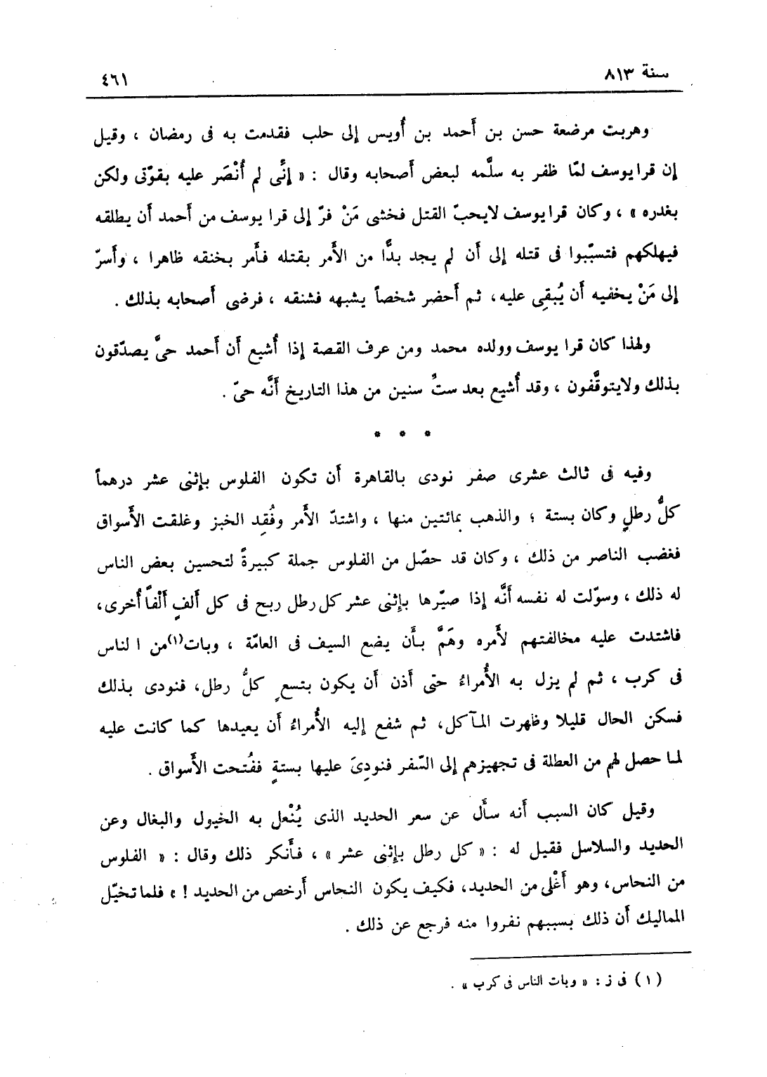 وفيه في ثالث عشري صفر نودي بالقاهرة أن تكون الفلوس باثني عشر درهماً لكل رطل، وكانت بستة والذهب بمائتين منها واشتد الأمر وفقد الخبز وغلقت الأسواق فغضب الناصر من ذلك وكان قد حصل من الفلوس جملة كثيرة لتحسين بعض الناس له ذلك وسولت له نفسه أنه إذا صيرها باثني عشر لكل رطل ربح في كل ألف ألفاً أخرى فاشتد عليه مخالفتهم لأمره وهم أن يضع السيف في العامة وبات الناس في كرب ثم لم يزل به الأمراء حتى أذن أن يكون بتسعة كل رطل، فنودي بذلك فسكن الحال قليلاً وظهرت المآكل ثم شفع إليه الأمراء أن يعيدها لما كانت عليه لما حصل لهم من العطلة في تجهيزهم إلى السفر فنودي عليها بستة فضجت الأسواق وقيل كان السبب أنه سأل عن سعر الحديد الذي ينعل به الخيول والبغال وعن سكك الحديد والسلاسل، فقيل له كل رطل باثني عشر فأنكر ذلك، وقال الفلوس من النحاس وهو أغلى من الحديد فكيف يكون النحاس أرخص من الحديد، فلما تخيل المماليك أن ذلك بسببهم ونفروا منه رجع عن ذلك.