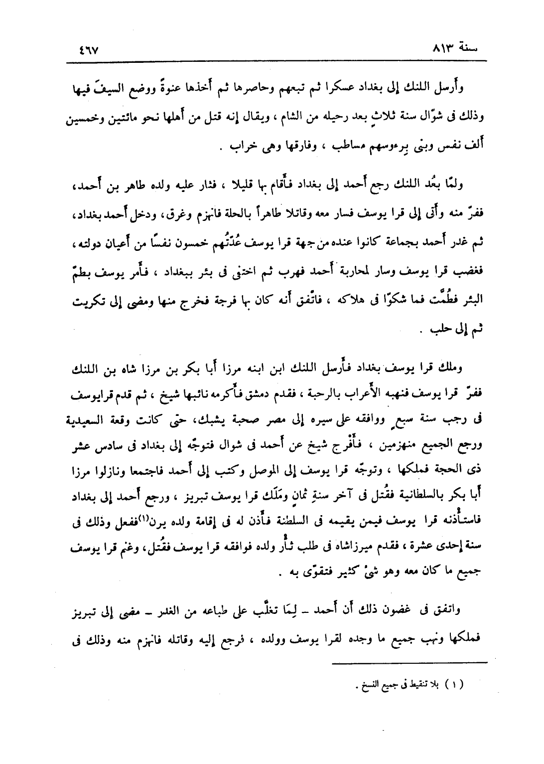 وأرسل اللنك إلى بغداد عسكراً ثم تبعهم وحاصرها ثم أخذها عنوة ووضع السيف فيها، وذلك في شوال سنة ثلاث بعد رحيله من الشام ويقال إنه قتل من أهلها نحو مائتين وخمسين ألف نفس وبنى برؤوسهم مساطب وفارقها وهي خراب، ولما بعد اللنك رجع أحمد إلى بغداد فأقام بها قليلاً فثار عليه ولده طاهر بن أحمد ففر منه وأتى إلى قرا يوسف فسار معه وقاتلا طاهر بالحلة فانهزم وغرق، ودخل أحمد بغداد ثم غدر أحمد بجماعة كانوا عنده من جهة قرا يوسف عدتهم خمسون نفساً من أعيان دولته، فغضب قرا يوسف وسار لمحاربة أحمد، فهرب ثم اختفى في بئر ببغداد، فأمر قرا يوسف بطم البئر، فطمت فما شكوا في هلاكه، فاتفق أنه كان بها فرجة فخرج منها ومضى إلى تكريت ثم إلى حلب، وملك قرا يوسف بغداد فأرسل إليه اللنك ابن ابنه مرزا أبي بكر بن مرزا شاه بن اللنك ففر قرا يوسف، فنهبه الأعراب بالرحبة فقدم دمشق فأنزله نائبها شيخ، ثم قدم قرا يوسف في رجب سنة سبع ووافقه على سيره إلى مصر صحبة يشبك حتى كانت وقعة السعيدية ورجع الجميع منهزمين، فأفرج شيخ عن أحمد في شوال فتوجه إلى بغداد في سادس عشر ذي الحجة فملكها، وتوجه قرا يوسف إلى الموصل وكتب إلى أحمد فاجتمعا ونازلوا مرزا أبي بكر بالسلطانية، فقتل في آخر سنة ثمان وملك قرا يوسف تبريز ورجع أحمد إلى بغداد، فاستأذنه قرا يوسف فيمن يقيمه في السلطنة، فأذن له بإقامة ولده بزق ففعل، وذلك في سنة إحدى عشرة، فقدم مرزا شاه في طلب ثأر ولده فواقعه قرا يوسف فقتل، وغنم قرا يوسف جميع ما كان معه وهو شيء كثير فتقوى به واتفق في غضون ذلك أن أحمد لما تغلب على طباعه من الغدر مضى إلى تبريز فملكها، ونهب جميع ما وجده لقرا يوسف وولده، فرجع إليه وقاتله فانهزم منه، وذلك في