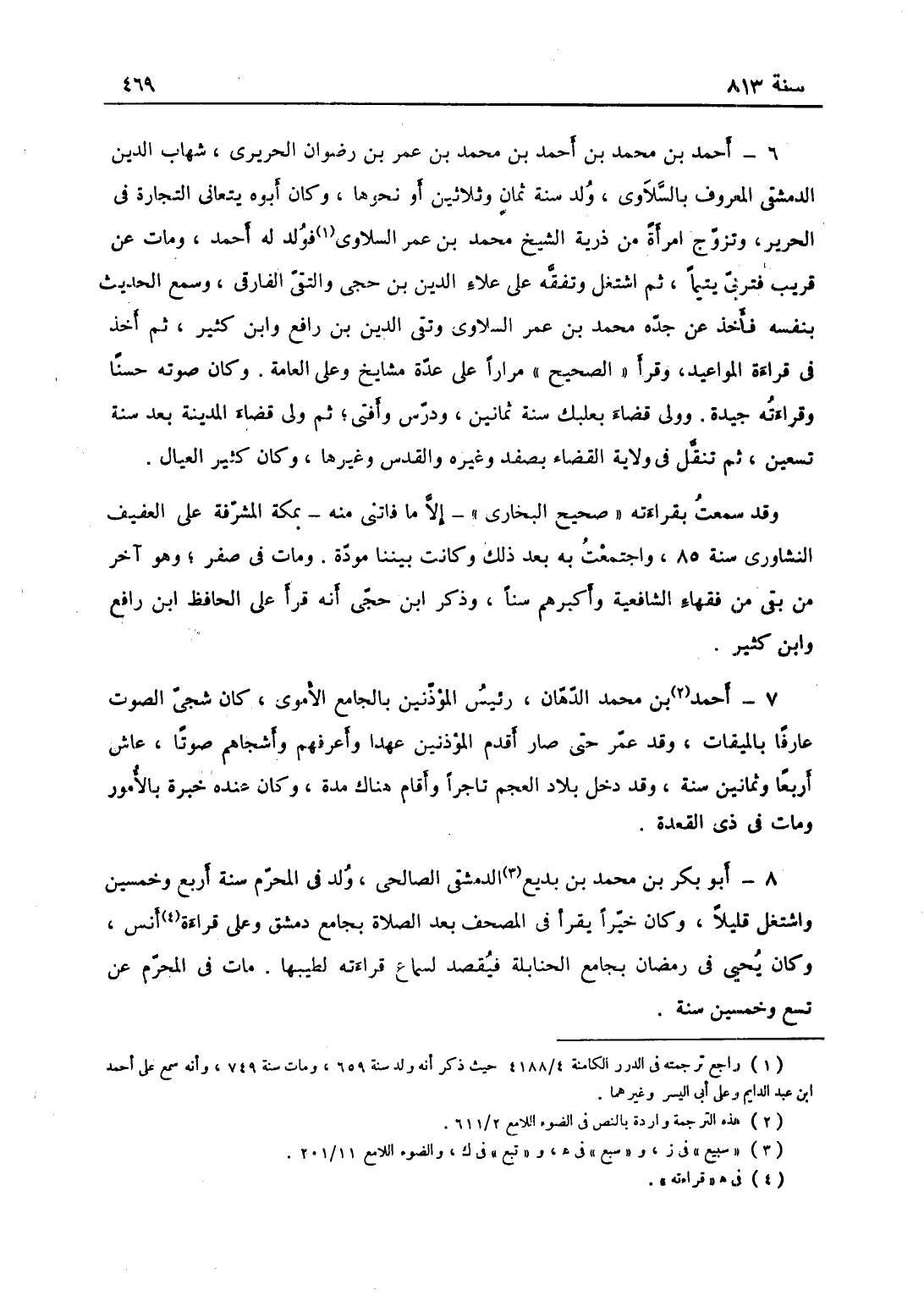 أحمد بن محمّد الدهان رئيس المؤذنين بالجامع الأموي، كان شجي الصوت، عارفاً بالميقات، وقد عمر حتى صار أقدم المؤذنين عهداً وأعرفهم وأشجاهم صوتاً، عاش أربعاً وثمانين سنة، وقد دخل بلاد العجم تاجراً وأقام هناك مدة، وكان عنده خبرة بالأمور، ومات في ذي القعدة.