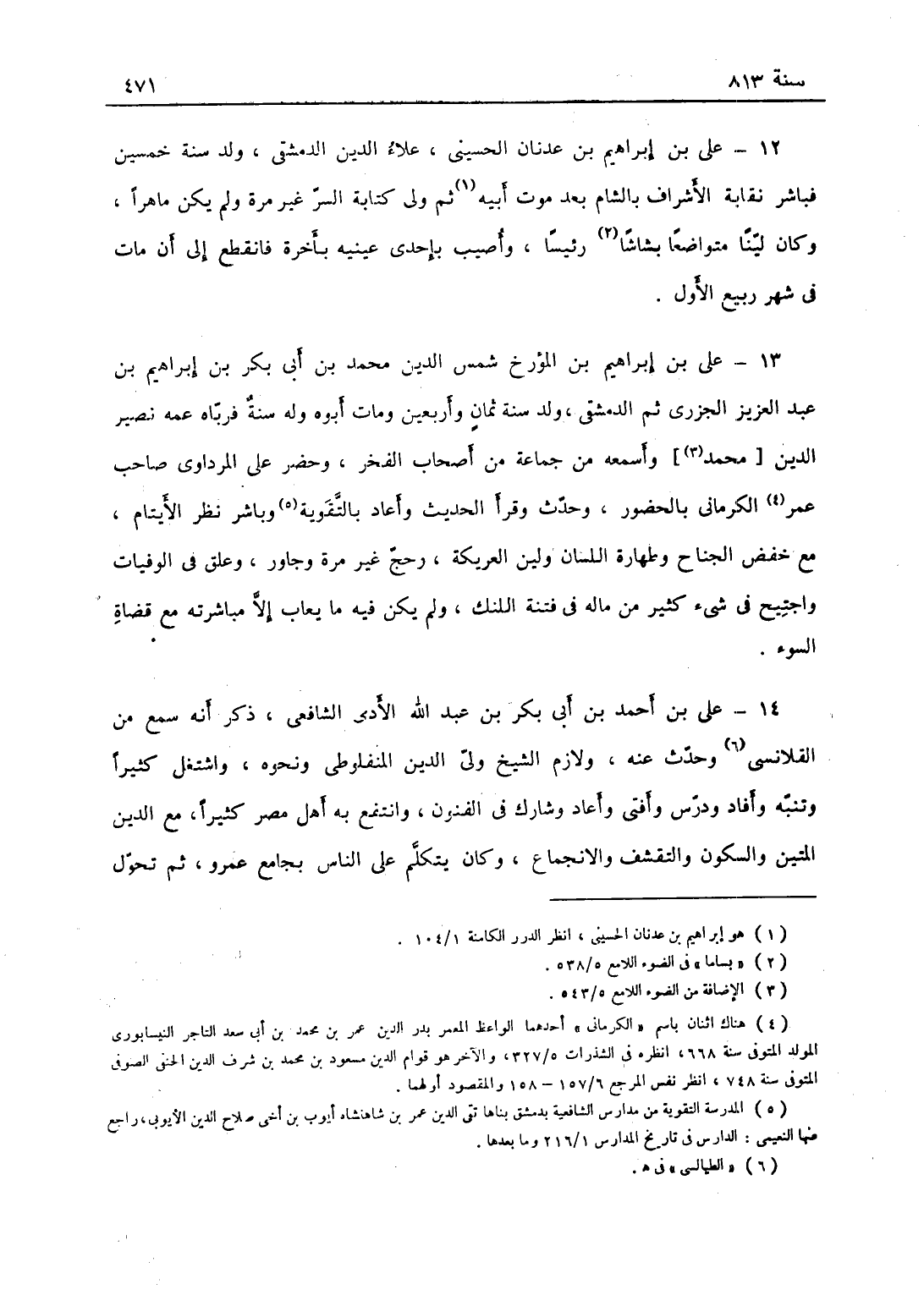 علي بن إبراهيم بن عدنان الحسيني علاء الدين الدمشقي، ولد سنة خمسين، فباشر نقابة الأشراف بالشام بعد موت أبيه، ثم ولي كتابة السر غير مرة، ولم يكن ماهراً، وكان ليناً، متواضعاً، بشاشاً رئيساً، وأصيب بإحدى عينيه بأخرة، فانقطع إلى أن مات في شهر ربيع الأول.