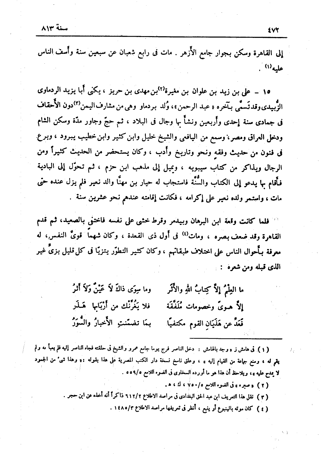 علي بن زيد بن علوان بن صبرة بن مهدي بن حريز يكنى أبا زيد الردماوي الزبيدي وقد تسمى بأخرة عبد الرحمن، ولد بردما وهي مشارف اليمن دون الأحقاف في جمادى سنة إحدى وأربعين ونشأ بها وجال في البلاد، ثم حج وجاور مدة وسكن الشام ودخل العراق ومصر، وسمع من اليافعي والشيخ خليل وابن كثير وابن خطيب يبروذ، وبرع في فنون من حديث وفقه ونحو تاريخ وأدب، وكان يستحضر من الحديث كثيراً ومن الرجال ويذاكر من كتاب سيبويه ويميل إلى مذهب ابن حزم، ثم تحول إلى البادية فأقام بها يدعو إلى الكتاب والسنة، فاستجاب له حيار بن مهنا والد نعير فلم يزل عنده حتى مات. واستمر ولده نعير على إكرامه فكانت إقامته عندهم نحو عشرين سنة، فلما كانت وقعة ابن البرهان وبيدمر وقرط خشي على نفسه فاختفى بالصعيد ثم قدم القاهرة وقد ضعف بصره، ومات في أول ذي القعدة وكان شهماً قوي النفس له معرفة بأحوال الناس على اختلاف طبقاتهم، وكان كثير التطور يتزيا في كل قليل بزي غير الزي الذي قبله ومن شعره: