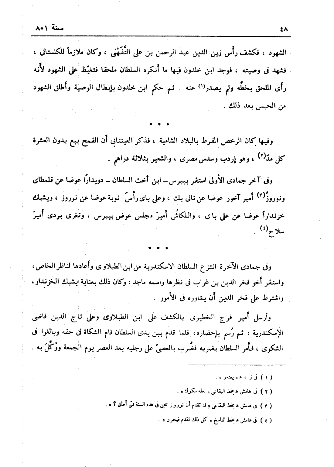 الشهود فكشف رأس زين الدين عبد الرحمن بن علي التفهيني وكان ملازماً للكلستاني فشهد في وصيته فوجد ابن خلدون فيها ما أنكره السلطان ملحقاً، فتغيظ على الشهود لأنه رأى الملحق بخطه ولم يعتذر عنه، ثم حكم ابن خلدون بابطال الوصية وأطلق الشهود من الحبس بعد ذلك.