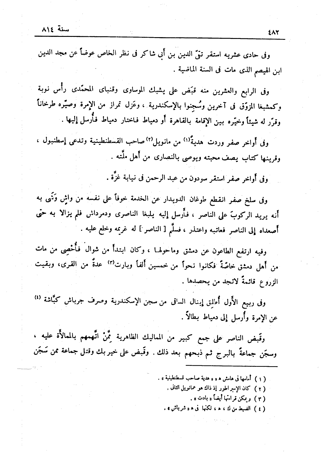 وفي أواخر صفر وردت هدية من مانويلي صاحب القسطنطينية وتدعى اصطنبول، وقرينها كتاب يصف محبته ويوصي بالنصارى من أهل ملته.