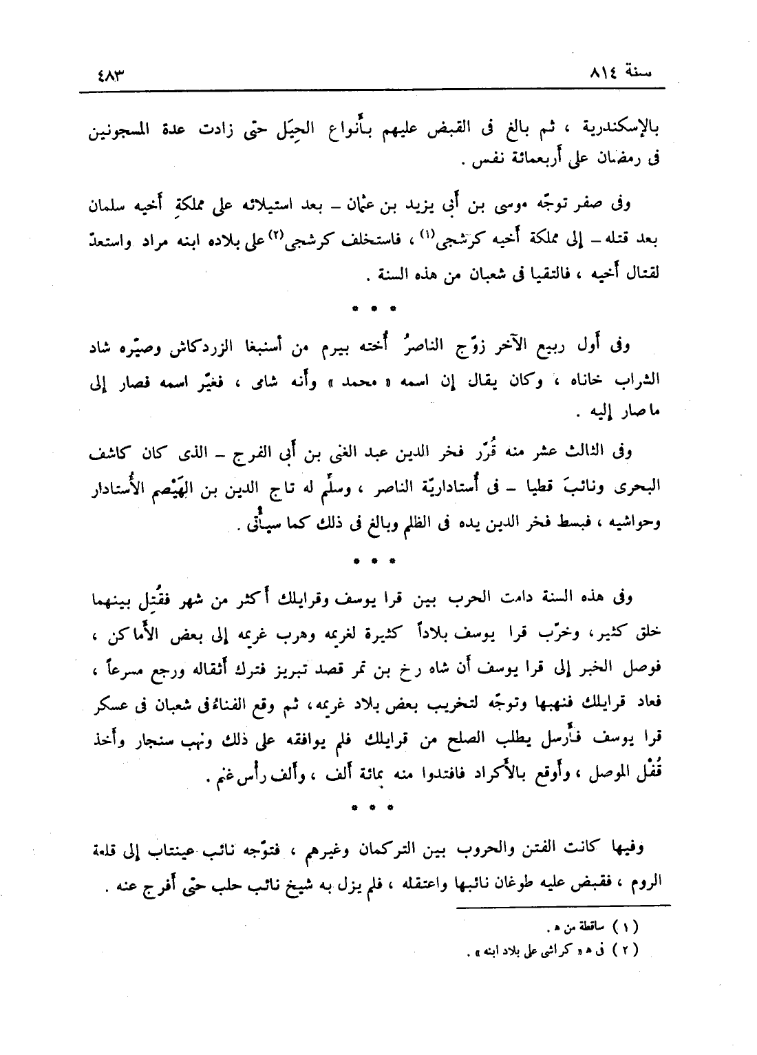 بالإسكندرية ثم بالغ في القبض عليهم بأنواع الحيل حتى زادت عدة المسجونين في رمضان على أربعمائة نفس. وفي صفر توجه موسى بن أبي يزيد بن عثمان بعد استيلائه على مملكة أخي سلمان بعد قتله إلى مملكة أخيه فاستخلف كرسجي على بلاد أبيه مراد واستعد لقتال أخيه فالتقيا في شعبان من هذه السنة.