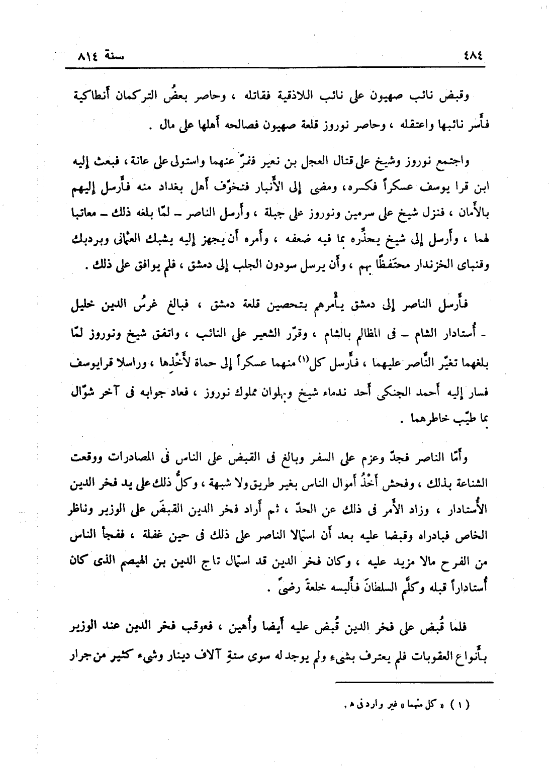 وقبض نائب صهيون على نائب اللاذقية فقتله، وحاصر بعض التركمان أنطاكية فأسر نائبها واعتقله، وحاصر نوروز قلعة صهيون فصالحه أهلها على مال، واجتمع نوروز وشيخ على قتال العجل بن نعير ففر منها فاستولى على عانة، فبعث ابن قرا يوسف عسكراً فكسره ومضى إلى الأنبار فتخوف أهل بغداد منهم فأرسل إليهم بالأمان، فنزل شيخ على سرمين ونوروز على جبلة وأرسل الناصر لما بلغه ذلك يعاتبهما وأرسل إلى شيخ يحذره بما فيه صنيعه وأمره أن يجهز يشيك العثماني وبردبك وقنباي الخازن دار محتفظاً بهم وأن يرسل سودون الجلب إلى دمشق فلم يوافق على ذلك فأرسل الناصر إلى دمشق يأمرهم بتحصين قلعة دمشق، فبالغ غرس الدين خليل أستادار الشام في المظالم بالشام وقرر الشعير على الجهات، واتفق شيخ ونوروز لما بلغهما تغير الناصر عليهما فأرسلا عسكر! إلى حماة لأخذها وراسلا قرا يوسف فسار أحمد الجنكي، أحد ندماء شيخ وبهلوان مملوك نوروز، فعاد جوابه في آخر شوال بما طاب به خاطرهما وأما الناصر فجد وعزم على السفر وبالغ في القبض على الناس في المصادرات ووقعت الشناعة بذلك وفحش أخذ أموال الناس بغير طريق ولا شبهة، وكل ذلك على يد فخر الدين الأستادار في ذلك على الحد، ثم أراد فخر الدين القبض على الوزير وناظر الخاص، فبادراه وقبضا عليه بعد أن استمالا الناصر على ذلك في حين غفلة منه، ففجيء الناس من الفرح مالا مزيد عليه، وكان فخر الدين قد استمال تاج الدين بن الهيصم الذي كان أستاداراً قبله وكلم السلطان فألبسه خلعة رضا، فلما قبض على فخر الدين قبض عليه أيضاً وأهين، فعوقب فخر الدين عند الوزير بأنواع العقوبات فلم يعترف بشيء ولم توجد له سوى ستة آلاف دينار وشيء كثير من جرار