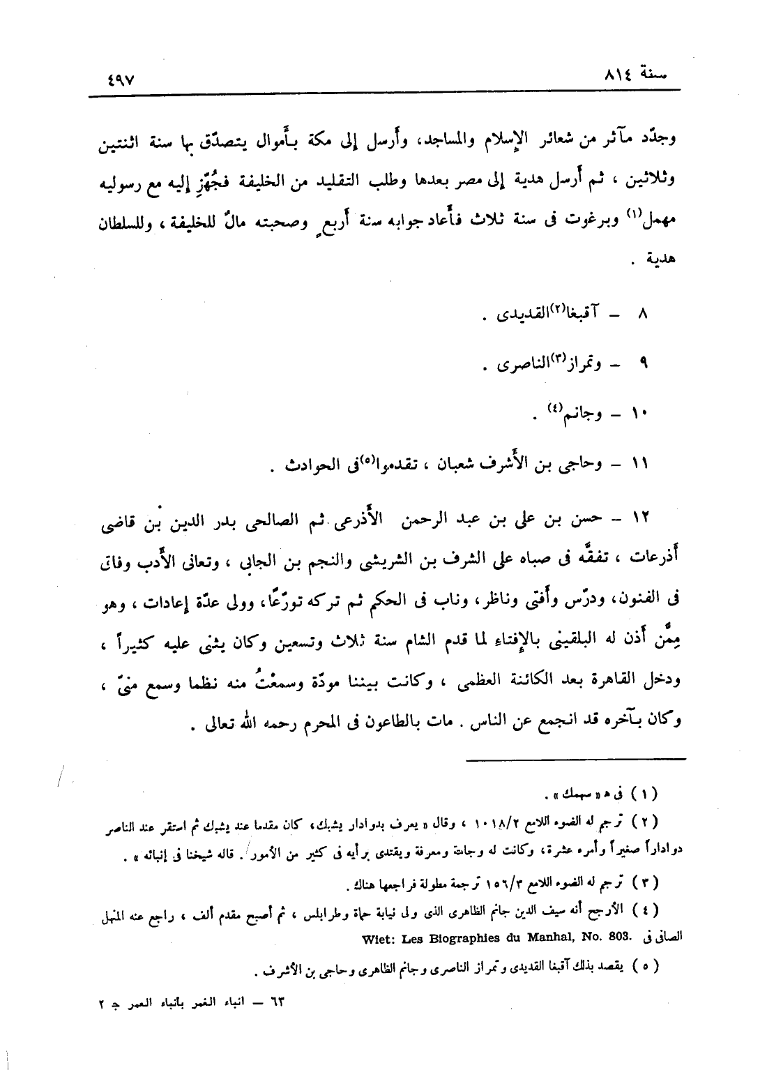 أقبغا القديدي وتمراز الناصري وجانم وحاجي بن الأشرف شعبان تقدموا في الحوادث.