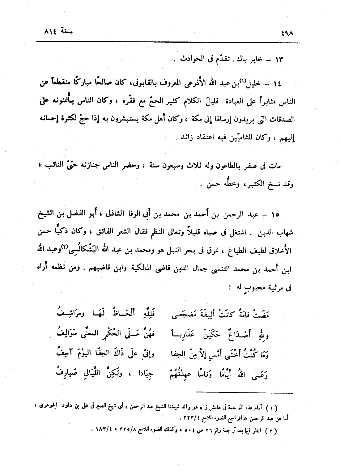 خليل بن عبد الله الأذرعي المعروف بالقابوني، كان صالحاً مباركاً منقطعاً عن الناس مثابراً على العبادة قليل الكلام كثير الحج مع فقره، وكان الناس يأتمنونه على الصدقات التي يريدون إرسالها إلى مكة، وكان أهل مكة يستبشرون به إذا حج لكثرة إحسانه م، وكان للشاميين فيه اعتقاد زائد، مات في صفر بالطاعون وله ثلاث وستون سنة، وحضر الناس جنازته حتى النائب، وقد نسخ الكثير للناس وخطه حسن.