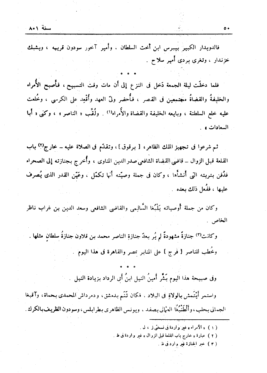 فالدوادار الكبير بيبرس، ابن أخت السلطان وأمير آخور سودون قريبه ويشبك خازندار وتغري بردى أمير سلاح، فلما دخلت ليلة الجمعة دخل في النزع إلى أن مات وقت التسبيح، فأصبح الأمراء والخليفة والقضاة مجتمعين في القصر فأحضر ولي العهد فأقعد على الكرسي وخلعت عليه خلع السلطنة وبايعه الخليفة والقضاة ولقب الناصر وكني أبا السعادات، ثم شرعوا في تجهيز الملك الظاهر وتقدم في الصلاة عليه خارج باب القلعة قبيل الزوال قاضي القضاة الشافعي صدر الدين المناوي وأخرج بجنازته إلى الصحراء فدفن بتربته التي أنشأها، وكان في جملة وصيته أنها تكمل وعين القدر الذي يصرف عليها ففعل ذلك بعده، وكان من جملة أوصيائه يلبغا السالمي والقاضي الشافعي وسعد الدين ابن غراب ناظر الخاص، وكانت جنازته مشهودة لم ير بعد جنازة الناصر محمد بن قلاوون جنازة سلطان مثلها، وخطب للناصر على المنابر بمصر والقاهرة في هذا اليوم وفي صبيحة هذا اليوم بشر أمين النيل ابن أبي الدرداء بزيادة النيل واستمر أيتمش بالولاة في البلاد فكان تنم بدمشق ودمرداش المحمدي بحماة وآقبغا الجمالي بحلب والطنبغا العثماني بصفد ويونس الظاهري بطرابلس وسودون الظريف بالكرك،