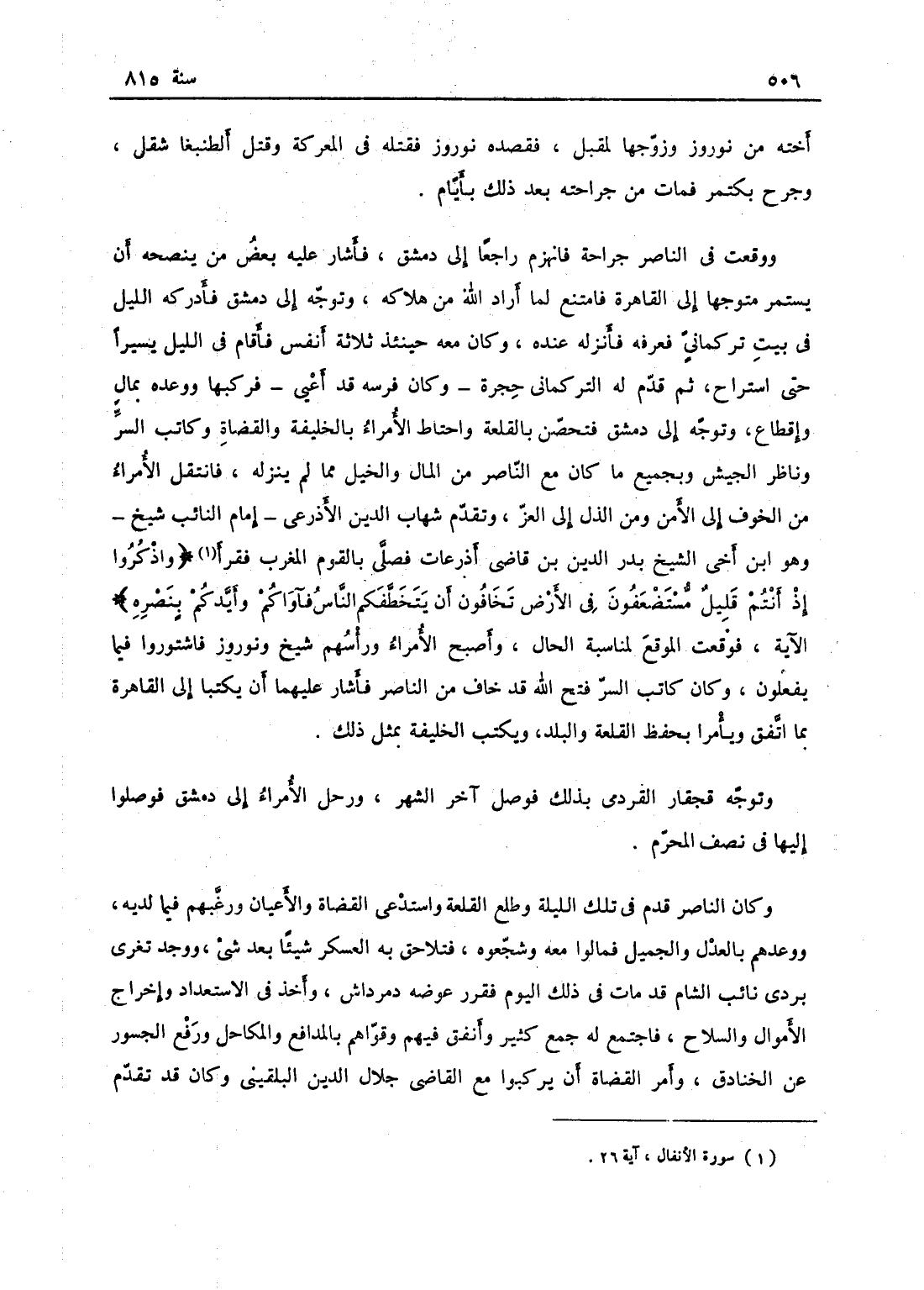 أخته من نوروز وزوجها لمقبل، فقصده نوروز فقتله في المعركة وقتل الطنبغا سقل وجرح سكب فمات من جراحه بعد ذلك بأيام، ووقعت في الناصر جراحة فانهزم راجعاً إلى دمشق، فأشار عليه بعض من ينصحه أن يتم مستمراً إلى القاهرة، فامتنع لما أراد الله من هلاكه وتوجه إلى دمشق فأدركه الليل في بيت تركماني فعرفه فأنزله عنده وكان معه حينئذ ثلاثة أنفس فأقام في الليل يسيراً حتى استراح، ثم قدم له التركماني حجرة وكان فرسه قد أعيا فركبها ووعده بمال وإقطاع وتوجه إلى دمشق فتحصن بالقلعة، واحتاط الأمراء بالخليفة والقضاة وكاتب السر وناظر الجيش وبجميع ما كان مع الناصر من المال والخيل مما لم يتركه محتسبا، فانتقل الأمراء من الخوف إلى الأمن ومن الذل إلى العز، وتقدم شهاب الدين الأذرعي أمام شيخ وهو ابن أخي بدر الدين ابن قاضي أذرعات فصلى بالقوم المغرب فقرأ " واذكروا إذ أنتم قليل مستضعفون في الأرض تخافون أن يتخطفكم الناس فاوئكم وأيدكم بنصره " - الآية
