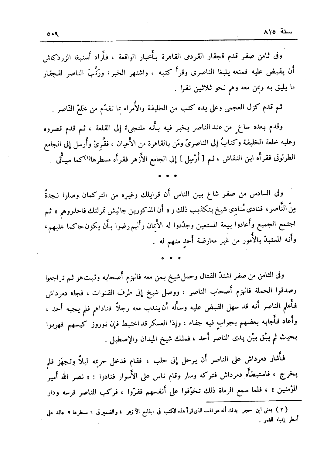 وفي الثاني من صفر اشتد القتال وحمل شيخ بمن معه فانهزم أصحابه وثبت هو ثم تراجعوا وصدقوا الحملة فانهزم أصحاب الناصر ووصل شيخ إلى طرف القنوات، فجاء دمرداش فأعلم الناصر أنه قد سهل القبض عليه وسأله أن يندب معه رجالاً، فناداهم فلم يجبه أحد فأعاد فأجابه بعضهم بجواب فيه جفاء وإذا العسكر قد احتيط بأن نوروز كبسهم، فهربوا بحيث لم يبق بين يدي الناصر أحد، فملك شيخ الميدان والإصطبل، فأشار دمرداش على الناصر أن يرحل إلى حلب، فقام فدخل حريمه ليلاً وتجهز فلم يخرج، فاستبطأه دمرداش فتركه وسار، وقام ناس على الأسوار فنادوا: نصر الله أمير المؤمنين! فلما سمع الرماة ذلك تخوفوا على أنفسهم ففروا، فركب الناصر فرسه ودار