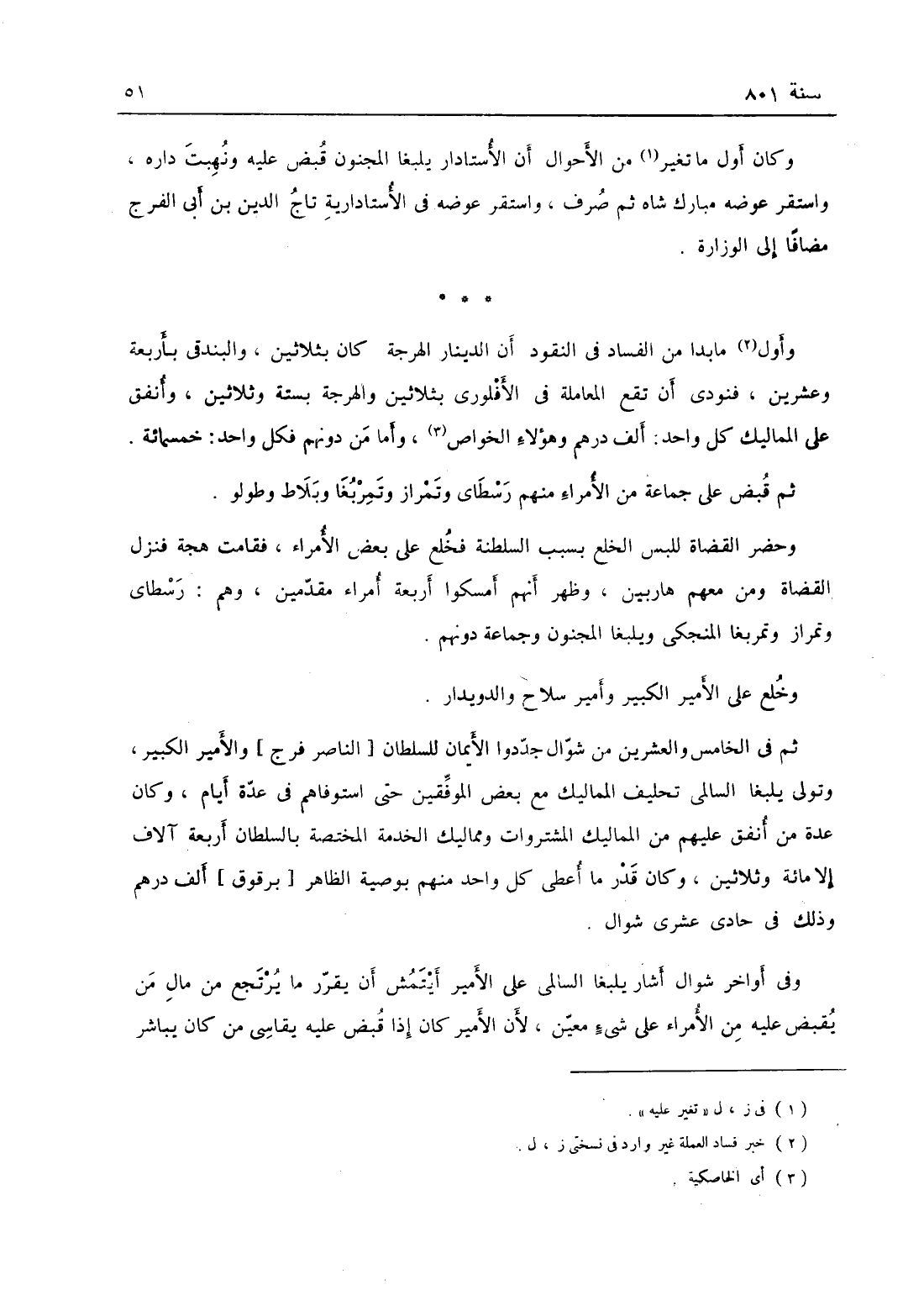 وكان أول ما تغير عليه من الأحوال أن الأستادار يلبغا المجنون قبض عليه ونهب داره واستقر عوضه مبارك شاه ثم صرف واستقر عوضه في الأستادارية تاج الدين ابن أبي الفرج مضافاً إلى الوزارة وحضر القضاة للبس الخلع بسبب السلطنة فخلع على بعض الأمراء فقامت هجة فنزل القضاة ومن معهم هاربين وظهر أنهم أمسكوا أربعة أمراء مقدمين وهم رسطاي وتمراز وتمربغا المنجكي ويلبغا المجنون وجماعة دونهم وخلع على الأمير الكبير وأمير سلاح والدويدار.