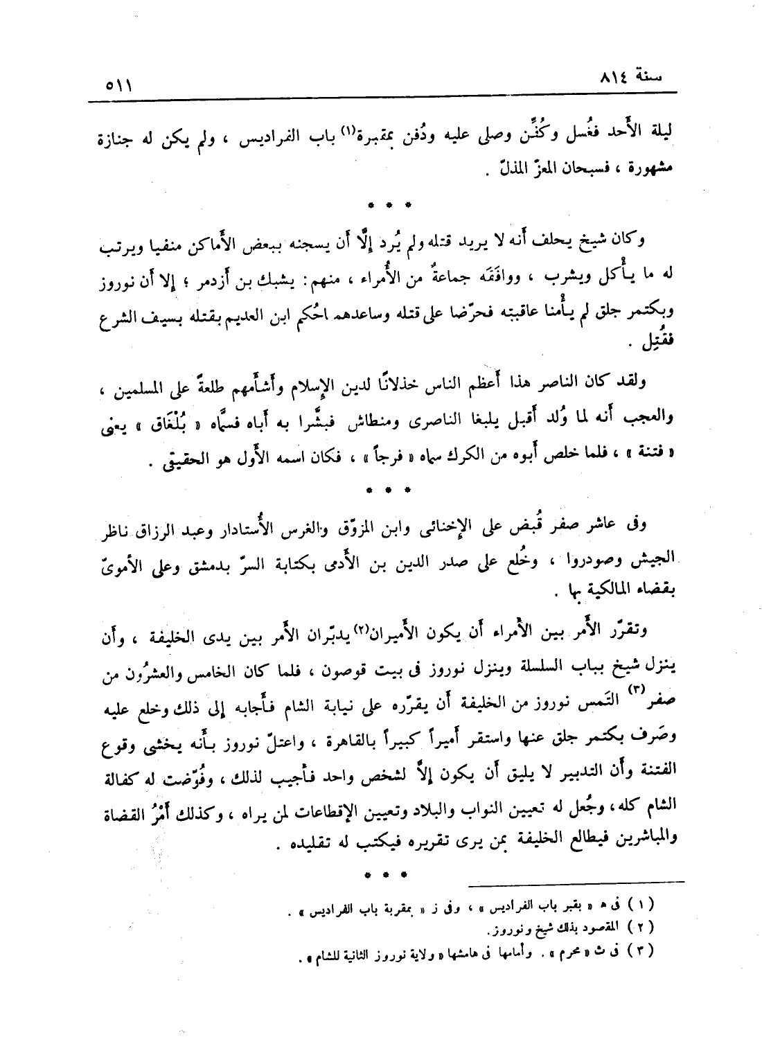ليلة الأحد فغسل وكفن وصلى عليه ودفن بقبر بباب الفراديس، ولم تكن له جنازة مشهودة فسبحان المعز المذل! وكان شيخ يحلف أنه لم يكن يريد قتله ولم يرد إلا أن يسجنه ببعض الأماكن مرفها ويرتب له ما يأكل ويشرب ووافقه جماعة من الأمراء منهم يشبك ابن أزدمر إلا أن نوروز وبكتمر جلق لم يأمنا عاقبته فحرضا على قتله وساعدهما حكم ابن العديم فقتله بسيف الشرع فقتل، ولقد كان الناصر هذا أعظم الناس خذلاناً لدين الإسلام وأشأمهم طلعة على المسلمين والعجب أنه ولد لما أقبل يلبغا الناصري ومنطاش فبشر أبوه فسماه بلغاق - يعني فتنة، فما خلص أبوه من الكرك سماه فرجا فكان اسمه الأول هو الحقيقي.