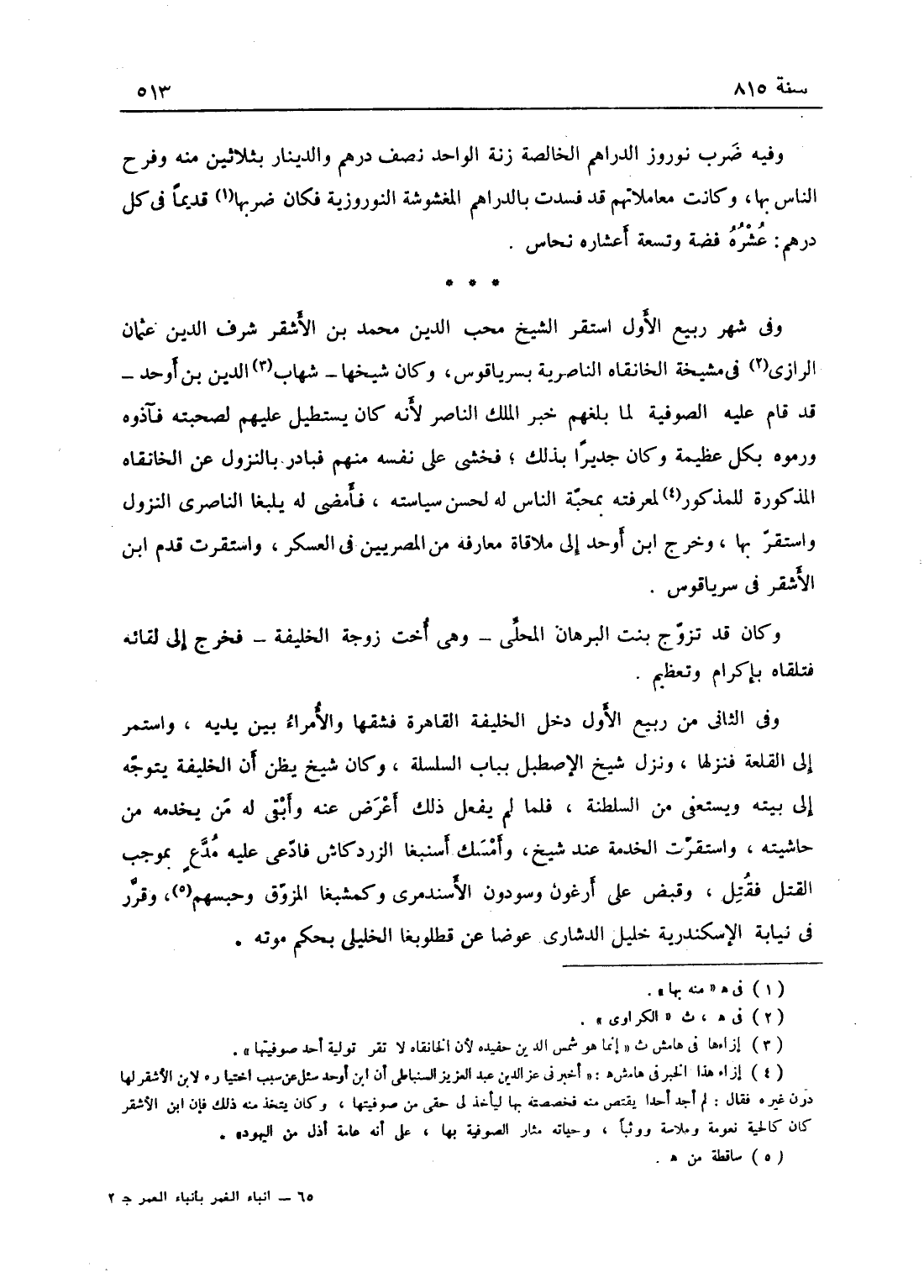 وفي شهر ربيع الأول استقر الشيخ محب الدين محمد بن الأشقر شرف الدين عثمان الكراوي في مشيخة الخانقاه الناصرية بسرياقوس وكان شيخها شهاب الدين ابن أوحد قد قام عليه الصوفية لما بلغهم خير الملك الناصر لأنه كان يستطيل عليهم بصحبته فآذوه ورموه بكل عظيمة وكان جديراً بذلك، فخشي على نفسه منهم فبادر بالنزول عن الخانقاه المذكورة للمذكور لمعرفته بمحبة الناس له لحسن سياسته، فأمضى له يلبغا الناصري النزول واستقر بها، وخرج ابن أوحد إلى ملاقاة معارفه من المصريين في العسكر، واستقرت قدم بن أشقر في سرياقوس، وكان قد تزوج بنت البرهان المحلى وهي أخت زوجة الخليفة، فخرج إلى لقائه فتلقاه بإكرام وتعظيم.