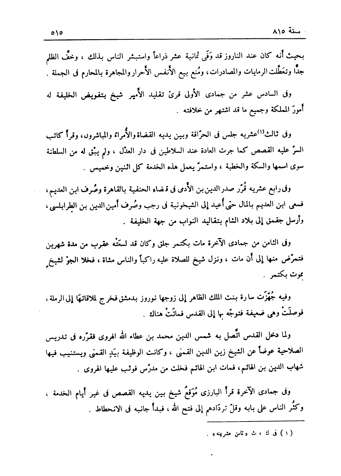 وفي ثالث عشر منه جلس في الحراقة وبين يديه القضاة والأمراء والمباشرون وقرأ كاتب السر عليه القصص كما جرت العادة عند السلاطين في دار العدل ولم يبق له من السلطنة سوى اسمها والسكة والخطبة، واستمر يعمل عنده الخدمة كل اثنين وخميس.