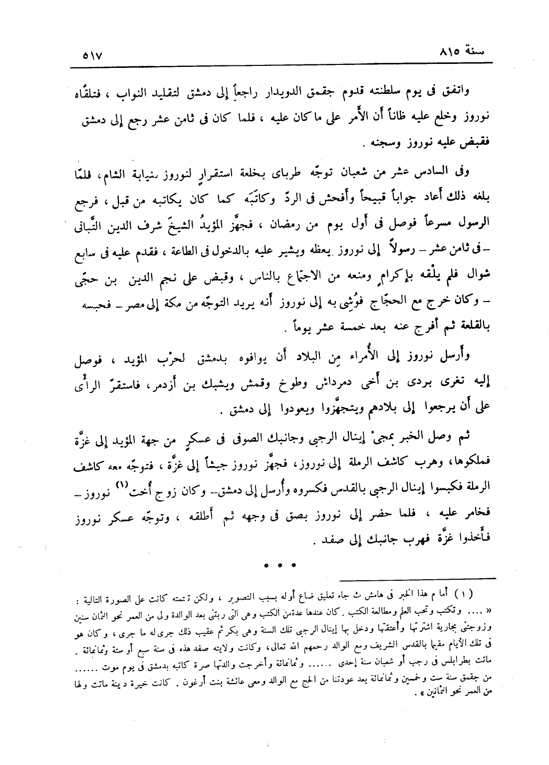 واتفق في يوم سلطنته قدوم جمقمق الدوادار راجعاً إلى دمشق لتقليد النواب - فتلقاه نوروز وخلع عليه ظانا أن الأمر على ما كان عليه، فلما كان في ثامن عشرة رجع إلى دمشق فقبض عليه نوروز وسجنه.