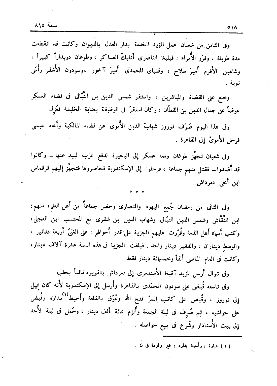 وفي الثاني من رمضان جمع ود والنصارى، وحضر جماعة من أهل العلم منهم ابن النقاش وشمس الدين التباني وشهاب الدين بن سنقري مع المحتسب ابن العجمي وكتب أسماء أهل الذمة وقررت عليهم الجزية على قدر أحوالهم، على الغني أربعة دنانير والوسط ديناران والفقير دينار واحد، فبلغت الجزية في هذا السنة عشرة آلاف دينار، وكانت في العام الماضي ألفا وخمسمائة فقط.
