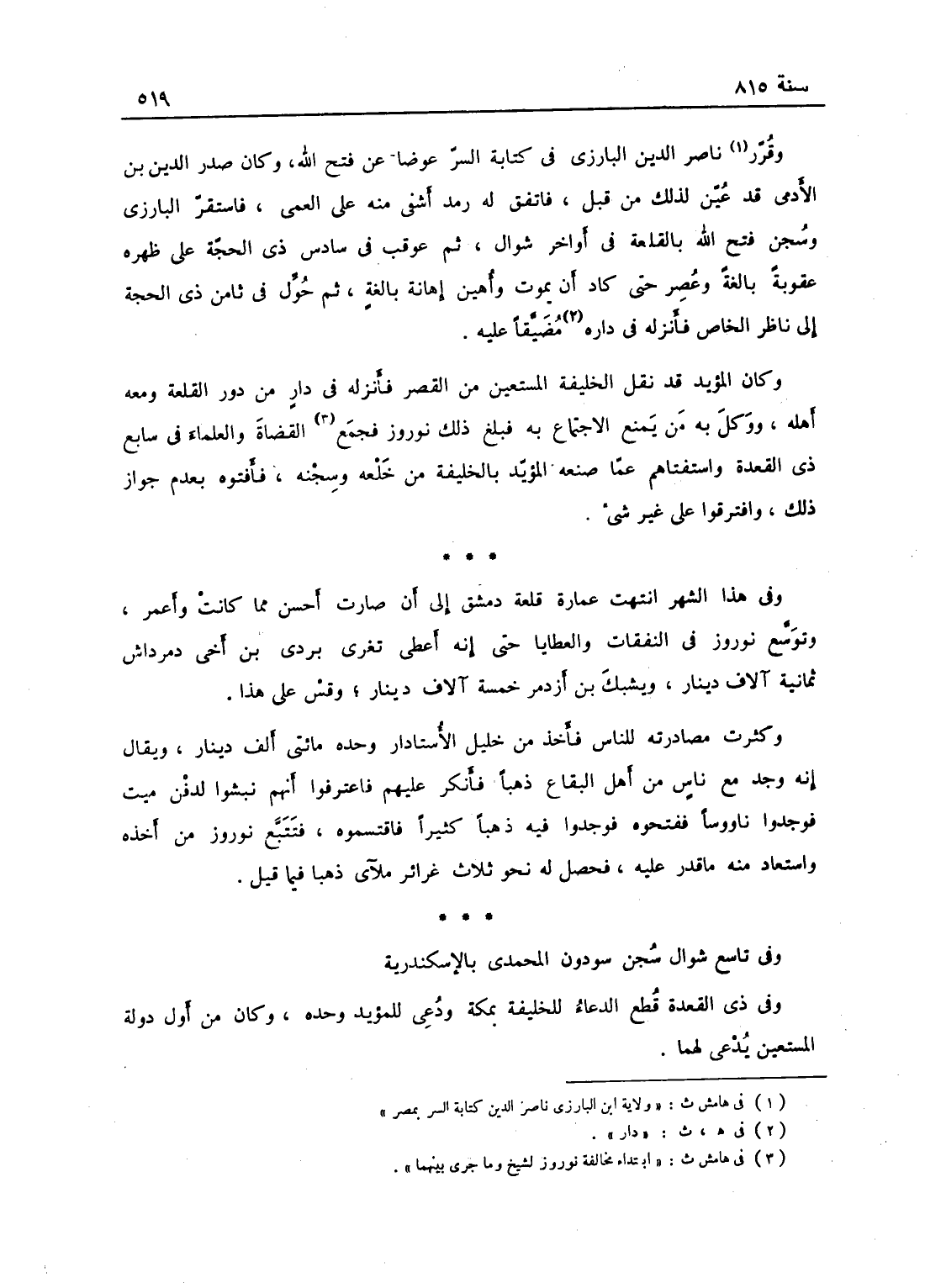 وقرر ناصر الدين البارزي في كتابه السر عوضا عن فتح الله، وكان صدر الدين الأدمي قد عين لذلك من قبل فاتفق له رمد أشفى منه على العمى، فاستقر البارزي وسجن فتح الله بالقلعة في أواخر شوال، ثم عوقب في سادس ذي الحجة على ظهره عقوبة بالغة وعصر حتى كاد أن يموت، ثم أهين إهانة بالغة ثم حول في ثامن ذي الحجة إلى ناظر الخاص فانزله في دار مضيفاً عليه وكان المؤيد وقد نقل الخليفة المستعين من القصر فأنزله في دار من دور القلعة ومعه أهله ووكل به من يمنع من الاجتماع به، فبلغ ذلك نوروز فجمع القضاة والعلماء في سابع ذي القعدة واستفتاهم عما صنعه المؤيد بالخليفة من خلعه وسجنه فأفتوا بعدم جواز ذلك وافترقوا عن غير شيء، وفي هذا الشهر انتهت عمارة قلعة دمشق إلى أن صارت أحسن مما كانت وأعمر، وتوسع نوروز في النفقات والعطايا حتى أنه أعطى تغري بردى ابن أخي دمرداش ثمانية آلاف دينار ويشبك بن أزدمر خمسة آلاف دينار - وقس على ذلك، وكثرت مصادراته للناس فأخذ من خليل الأستادارا وحده مائتي ألف دينار، ويقال إنه وجد مع ناس من أهل البقاع ذهباً فأنكر عليهم، فاعترفوا أنهم نبشوا لدفن ميت فوجودا ناووسا ففتحوه فوجدوا فيه ذهباً كثيراً فاقتسموه فتتبع نوروز من أخذه واستعاد منه ما قدر عليه، فحصل له نحو ثلاث غرائر ملأى ذهباً فيما قيل.