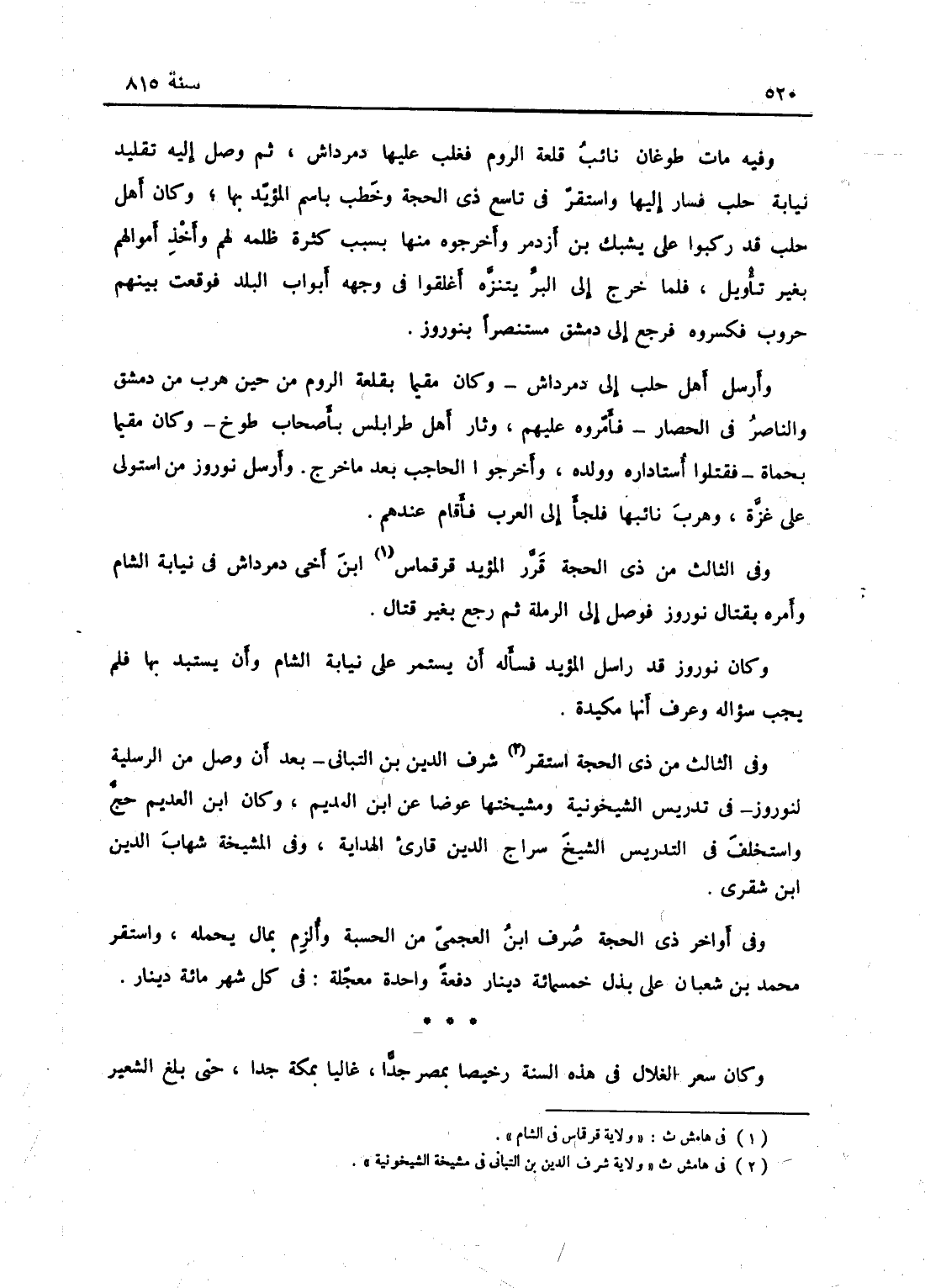 وفيه مات طوغان نائب قلعة الروم فتغلب عليها دمرداش ثم وصل تقليد بنيابة حلب فسار ا، واستقر في تاسع ذي الحجة وخطب باسم المؤيد بها، وكان أهل حلب قد ركبوا على يشبك بن أزدمر وأخرجوه منها بسبب كثرة ظلمه لهم وأخذ أموالهم بغير تأويل، فلما خرج إلى البر يتنزه أغلقوا في وجهه أبواب البلد، فوقعت بينهم حروب ببانقوسا فكسروه فرجع إلى دمشق مستنصراً بنوروز، وأرسل أهل حلب إلى دمرداش وكان مقيما بقلعة الروم من حين هرب من دمشق والناصر في الحصار فأمروه عليهم، وأثار أهل طرابلس بأصحاب طوخ وكان مقيما بحماة فقتلوه أستاداره وولده وأخرجوا الحاجب بعد ما خرج، وأرسل نوروز من استولى على غزة، وهرب نائبها فلجأ إلى العرب فأقام عندهم.
