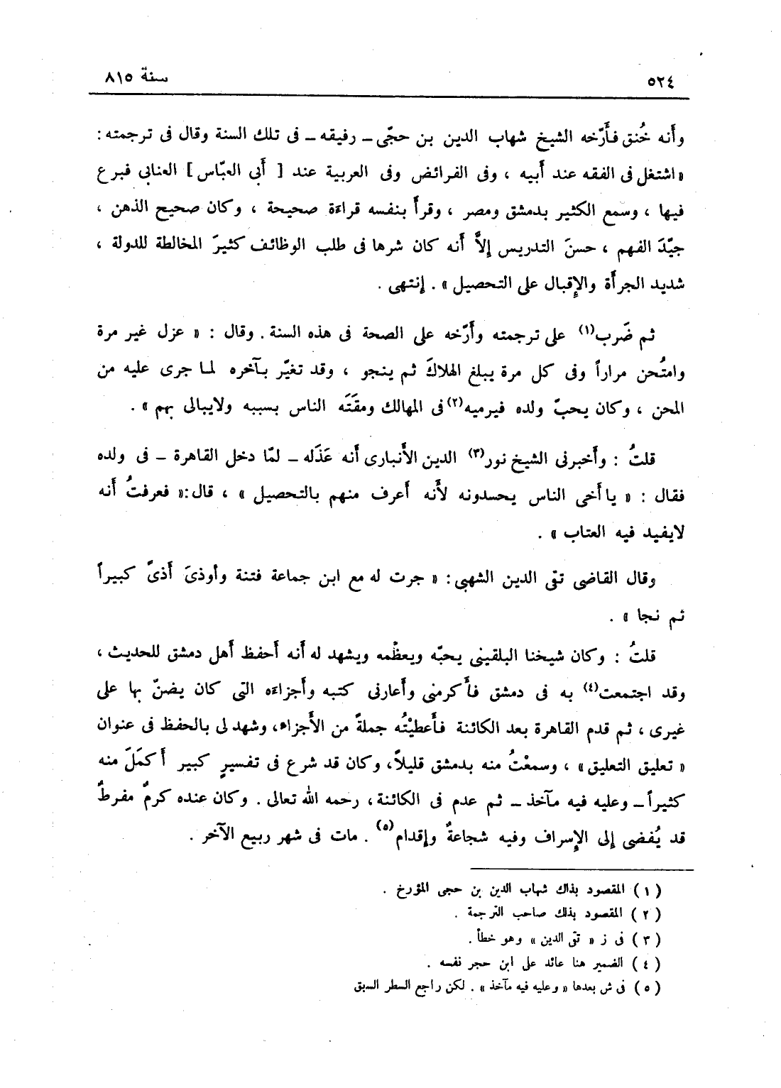 وانه خنق فأرخه الشيخ شهاب الدين ابن حجي رفيقه في تلك السنة، وقال في ترجمته: اشتغل في الفقه عند أبيه وفي الفرائض وفي العربية عند العنابي فبرع فيها وسمع الكثير في دمشق ومصر وقرأ بنفسه قراءة صحيحة وكان صحيح الذهن جيد الفهم حسن التدريس إلا أنه كان شرها في طلب الوظائف كثير المخالطة للدولة شديد الجرأة والإقبال على التحصيل انتهى. ثم صرب على ترجمته وأرخه على الصحة في هذا السنة وقال: عزل غير مرة وامتحن مراراً وفي كل مرة يبلغ الهلاك ثم ينجو، وقد تغير بأخرة لما جرى عليه من المحن وكان يحب ولده فيرميه في المهالك، ومقته الناس بسببه ولا يبالي بهم، قلت: وأخبرني الشيخ نور الدين الأيباري أنه عذله لما دخل القاهرة في ولده فقال: يا أخي! الناس يحسدونه لأنه أعرف منهم بالتحصيل، فعرفت أنه لا يفيد فيه العتاب، وقال القاضي تقي الدين الشهبي: جرت له مع ابن جماعة فتنة وأوذي أذى كثيراً ثم نجا، قلت: وكان شيخنا البلقيني يحبه ويعظمه وشهد له أنه أحفظ أهل دمشق للحديث حتى ولى الأشرفية، وقد اجتمعت به بدمشق فأكرمني وأعارني كتبه، وأجزاءه التي كان يضن بها عن غيري، ثم قدم القاهرة بعد الكائنة فأعطيته جملة من الأجزاء وشهد لي بالحفظ في عنوان تعليق التعليق، وسمعت منه بدمشق قليلا، وكان قد شرع في تفسير كبير أكمل منه كثيراً وعليه فيه مآخذ ثم عدم في الكائنة - رحمه الله تعالى وكان عنده كرم مفرط قد يفضي إلى الأشراف، وفيه شجاعة وإقدام، مات في شهر ربيع الآخر.