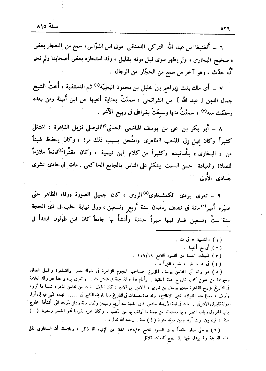 الطنبغا بن عبد الله التركي الدمشقي مولى ابن القواس سمع من الحجاز بعض صحيح البخاري ولم يظهر سوى قبل موته بقليل، وقد استجازه بعض أصحابنا ولم نعلم أنه حدث، وهو آخر من سمع من الحجاز من الرجال.
