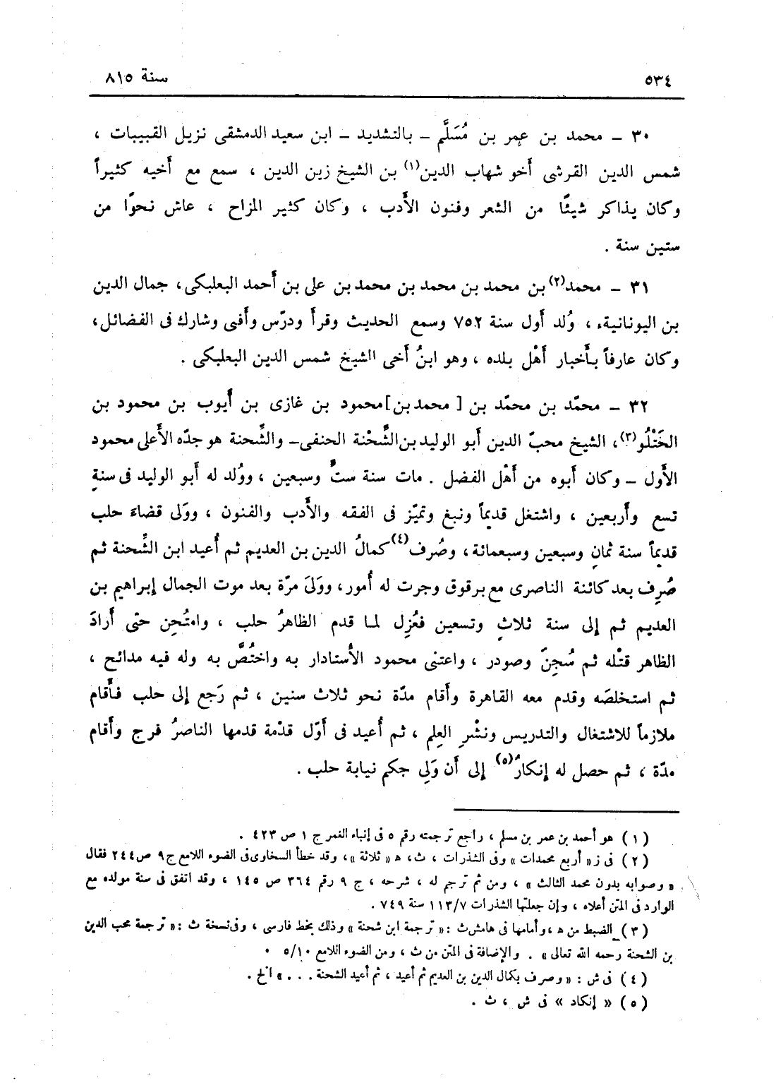 محمد بن محمد بن محمد بن علي بن أحمد البعلبكي جمال الدين ابن اليونانية، ولد أول سنة 752 وسمع الحديث وقرأ ودرس وأفتى وشارك في الفضائل، وكان عارفاً بأخبار أهل بلده. وهو ابن أخي الشيخ شمس الدين البعلبكي. محمد بن محمد بن محمد بم محمود بن غازي بن أيوب بن محمود بن الختلو الشيخ محب الدين أبو الوليد بن الشحنة الحنفي والشحنة هو جده الأعلى محمود الأول وكان أبوه من أهل الفضل، مات سنة ست وسبعين، وولد له أبو الوليد سنة تسع وأربعين، واشتغل قديما ونبغ وتميز في الفقه والأدب والفنون، وولي قضاء حلب قديماً سنة ثمان وستين وسبعمائة وصرف جمال الدين ابن العديم ثم أعيد ابن الشحنة، وصرف جمال الدين ابن العديم ثم اتمير ابن الشحنة ثم صرف بعد كائنة الناصري مع برقوق وصرت له امور ولي مرة مدة بعد موت إبراهيم بن العديم ثم إلى سنة ثلاث وتسعين، فعزل لما قدم الظاهر حلب، وامتحن حتى أراد الظاهر قتله ثم سجن ثم صودر، واعتنى محمود الأستادارية به واختص به وله فيه مدائح، ثم استخلصه وقدم معه القاهرة وأقام بها مدة نحو ثلاث سنين، ثم رجع إلى حلب فأقام ملازماً بالاشتغال والتدريس ونشر العلم، ثم أعيد أول قدمة قدمها الناصر فرج وأقام مدة ثم حصل له أنكاد إلى أن ولي جكم نيابة حلب