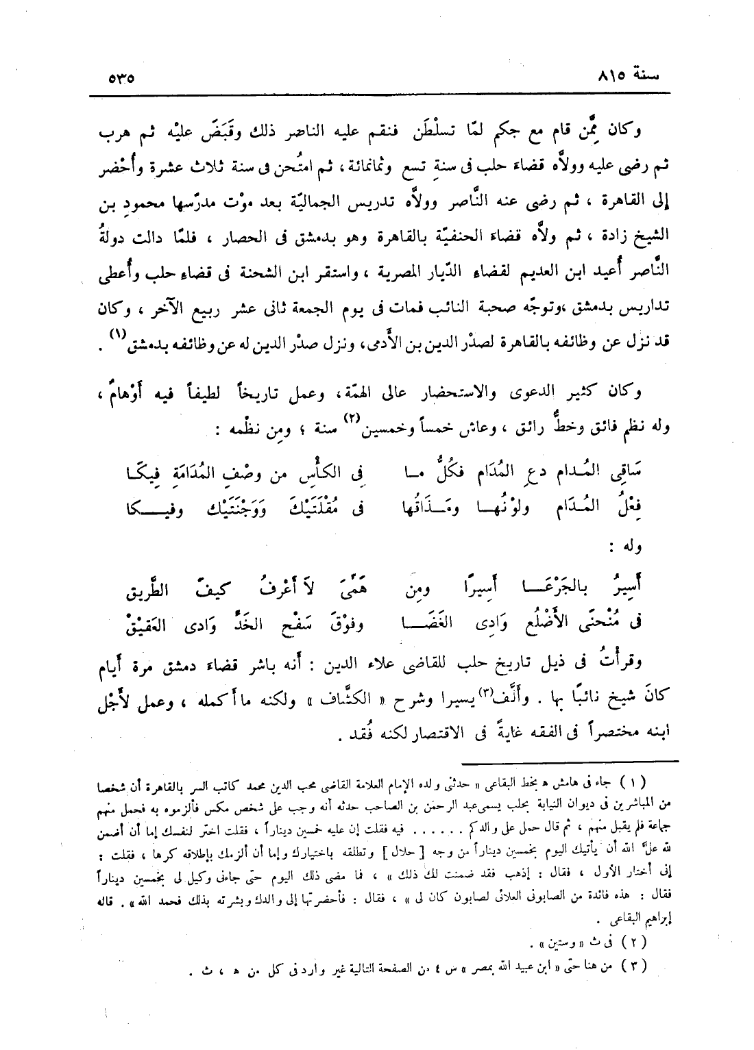 وكان ممن قام مع جكم لما تسلطن فنقم عليه الناصر ذلك وقبض عليه، ثم هرب ثم رضي عليه وولاه قضاء حلب في سنة تسع وثمانمائة، ثم امتحن في سنة ثلاث عشرة وأحضر إلى القاهرة، ثم رضي عنه الناصر وولاه تدريس الجمالية بعد موت مدرسها محمود بن الشيخ زاده، ثم ولاه قضاء الحنفية بالقاهرة وهو بدمشق في الحصار، فلما زالت دولة الناصر أعيد ابن العديم لقضاء الديار المصرية واستقر ابن الشحنة في قضاء حلب وأعطى تداريس بدمشق وتوجه صحبة النائب، فمات يوم الجمعة في ثاني عشر ربيع الآخر، وكان نزل عن وظائفه بالقاهرة لصدر الدين ابن الأدمي، وأنزل صدر الدين له عن وظائفه بدمشق، وكان كثير الدعوى والاستحضار عالي الهمة، وعمل تاريخاً لطيفا فيه أوهام عديدة، وله نظم فائق وخط رائق، عاش خمسا وستين سنة، ومن نظمه: