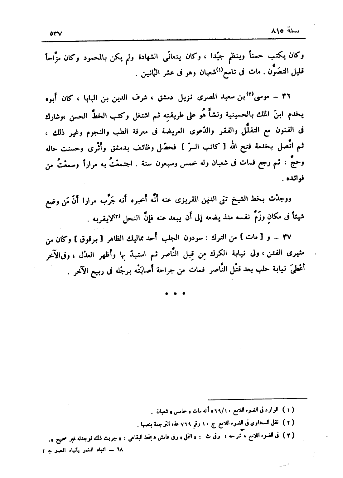 موسى بن سعيد المصري نزيل دمشق شرف الدين ابن البابا كان أبوه يخدم ابن الملك بالحسينية ونشأ هو على طريقته ثم اشتغل وكتب الخط الحسن وشارك في الفنون مع التقلل والفقر والدعوى العريضة في معرفة الطب والنجوم وغير ذلك، ثم اتصل بخدمة فتح الله فحصل وظائف بدمشق وأثرى وحسنت حاله، حج ثم رجع فمات في شعبان وله خمس وسبعون سنة، اجتمعت به مراراً وسمعت من فوائده، ووجدت بخط الشيخ تقي الدين المقريزي عنه أنه أخبره أنه جرب مراراً أن من وضع الشيء بمكان وزم نفسه منذ يضعه إلى أن يبعد عنه فإن النمل لا يقربه.
