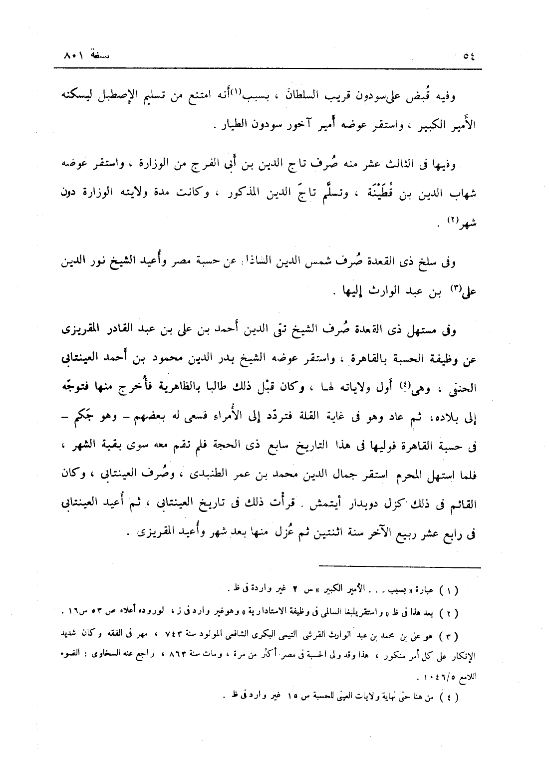 قرأت ذلك في تاريخ العينتابي ثم اعيد العينتابي في رابع عشر ربيع الآخر من سنة اثنتين ثم عزل منها بعد شهر وأعيد المقريزي،
