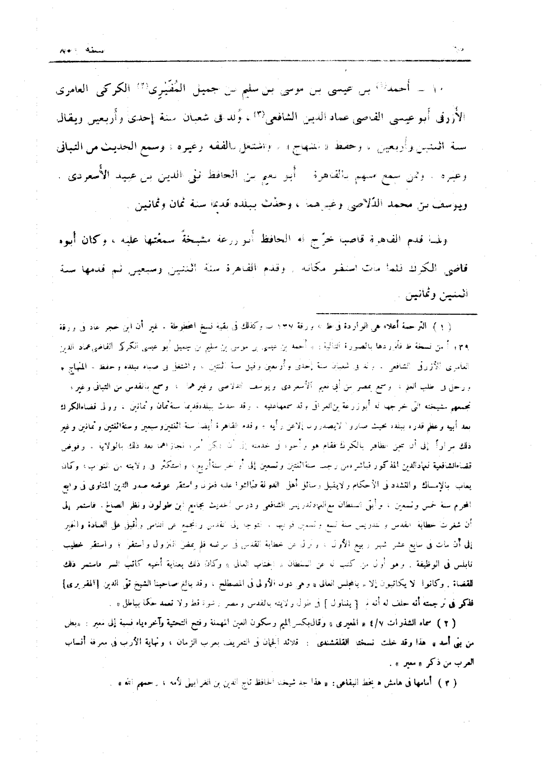 أحمد بن عيسى بن موسى ابن سليم بن جميل المقيري الكركي العامري الأزرقي أبو عيسى القاضي عماد الدين الشافعي ولد في شعبان سنة إحدى وأربعين، وحفظ المنهاج وجامع المختصرات وغيرهما واشتغل بالفقه وغيره وسمع الحديث من البياني ةغيره وممن سمع منهم بالقاهرة أبو نعيم ابن الحافظ تقي الدين عبيد الإسعردي ويوسف بن محمد الدلاصي وغيرهما وحدث ببلده قديماً سنة ثمان وثمانين ولما قدم القاهرة قاضياً خرج له الحافظ أبو زرعة مشيخة سمعتها عليه وكان أبوه قاضي الكرك فلما مات استقر مكانه وقدم القاهرة سنة اثنتين وسبعين ثم قدمها سنة اثنتين وثمانين