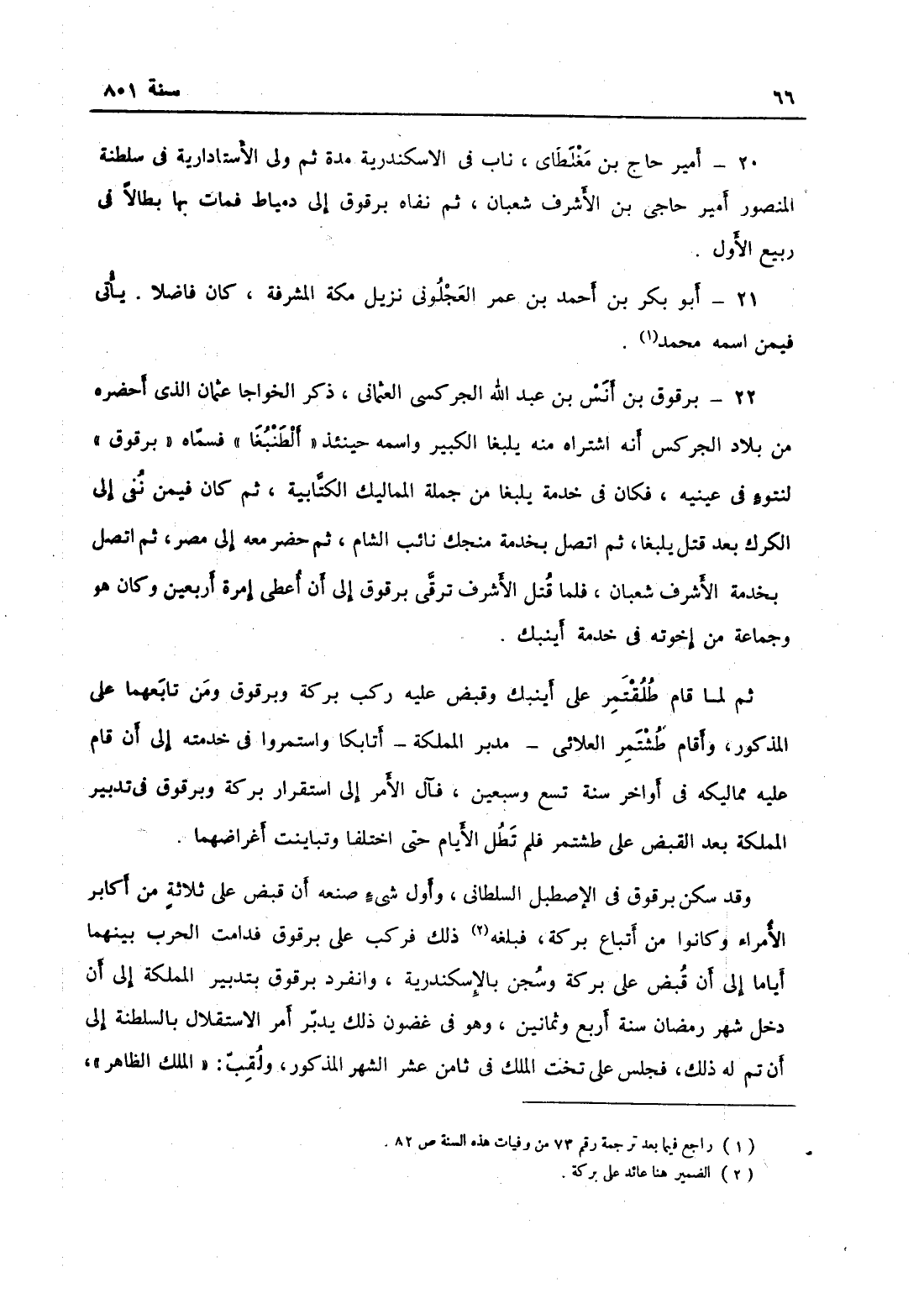برقوق بن آنص بن عبد الله الجركسي العثماني، ذكر الخواجا عثمان الذي أحضره من بلاد الجركس أنه اشتراه منه يلبغا الكبير واسمه حينئذ الطنبغا فسماه برقوقاً لنتو في عينيه فكان في خدمة يلبغا من جملة المماليك الكتابية، ثم كان فيمن نفي إلى الكرك بعد قتل بلبغا، ثم اتصل بخدمة منجك نائب الشام، ثم حضر معه إلى مصر واتصل بخدمة الأشرف شعبان، فلما قتل الأشرف ترقى برقوق إلى أن أعطي إمرة أربعين وكان هو وجماعة من إخوته في خدمة أينبك، ثم لما قام طلقتمر على أينبك وقبض عليه ركب برقوق وبركة ومن تابعهما على المذكور وأقاما طشتمر العلاي مدبر المملكة أتابكاً، واستمروا في خدمته إلى أن قام عليه مماليكه في أواخر سنة تسع وسبعين فآل الأمر إلى استقرار برقوق وبركة في تدبير المملكة بعد القبض على طشتمر، فلم تطل الأيام حتى اختلفا وتباينت أغراضهما وقد سكن برقوق في الاصطبل السلطاني، فأول شيء صنعه أن قبض على ثلاثة من أكابر الأمراء كانوا من أتباع بركة، فبلغه ذلك فركب على برقوق فدام الحرب بينهما أياماً إلى أن قبض على بركة وسجن بالإسكندرية، وانفرد برقوق بتدبير أمور المملكة إلى أن دخل شهر رمضان سنة أربع وثمانين وهو في غضون ذلك يدبر أمر الستقلال بالسلطنة إلى أن تم له ذلك، فجلس على تخت الملك في ثامن عشر الشهر المذكور ولقب بالملك الظاهر،