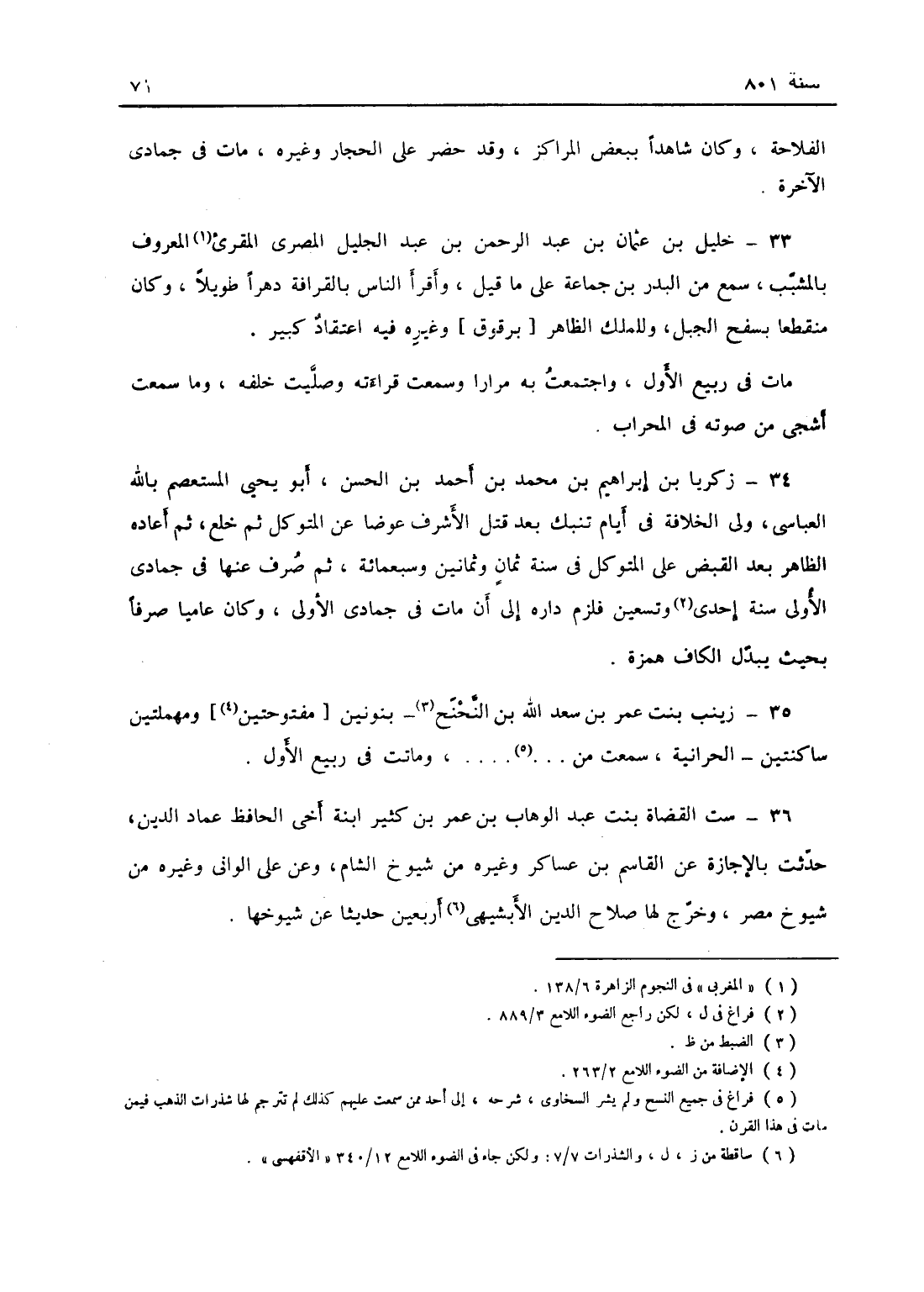 خليل بن عثمان بن عبد الرحمن بن عبد الجليل المصري المقرئ المعروف بالمشبب، سمع من البدر ابن جماعة على ما قيل، وأقرأ الناس بالقرافة دهراً طويلاً، وكان منقطعاً بسفح جبل، وللملك الظاهر وغيره فيه اعتقاد كبير، مات في ربيع الأول، اجتمعت به مراراً وسمعت قراءته وصليت خلفه، وما سمعت أشجى من صوته في المحراب.