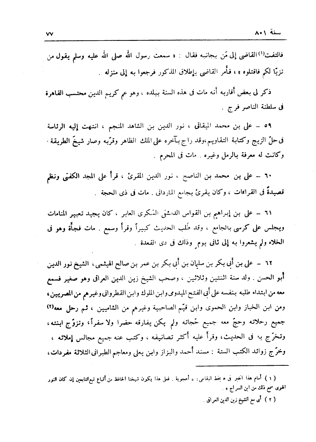 علي بن محمد بن القاصح نور الدين المقرئ قرأ على المجد الكفتي ونظم قصيدة في القراآت وكان يقرأ في جامع المارداني، مات في ذي الحجة، عمر بن إبراهيم بن القواس الدمشقي السكري العابر كان يجيد تعبير المنامات ويجلس على كرسي بالجامع وقد طلب الحديث كثيراً وقرأ وسمع، مات فجأة وهو في الخلاء ولم يشعروا به إلا في ثاني يوم وذلك في ذي القعدة.