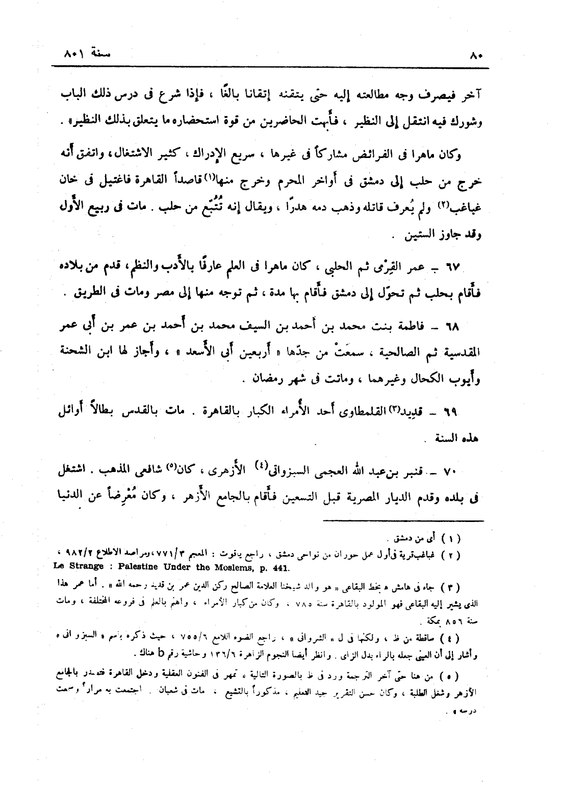 آخر فيصرف وجه مطالعته إليه حتى يتقنه إتقاناً بالغاً فإذا شرع في درس ذلك الباب وشورك فيه انتقل إلى النظير فأبهت الحاضرين من قوة استحضاره ما يتعلق بذلك النظير وكان ماهراً في الفرائض مشاركاً في غيرها سريع الإدراك كثير الاشتغال، واتفق أنه خرج من حلب إلى دمشق في أواخر المحرم وخرج منها قاصداً القاهرة فاغتيل في خان غباغب ولم يعرف قاتله وذهب دمه هدراً، ويقال إنه تتبع من حلب وكان جال في البلاد ونظم نظماً حسناً ورحلا من حلب إلى دمشق ففقد الطريق وكان قد درس بحلب وحصل بها وظائف، مات في ربيع الأول وقد جاوز الستين.