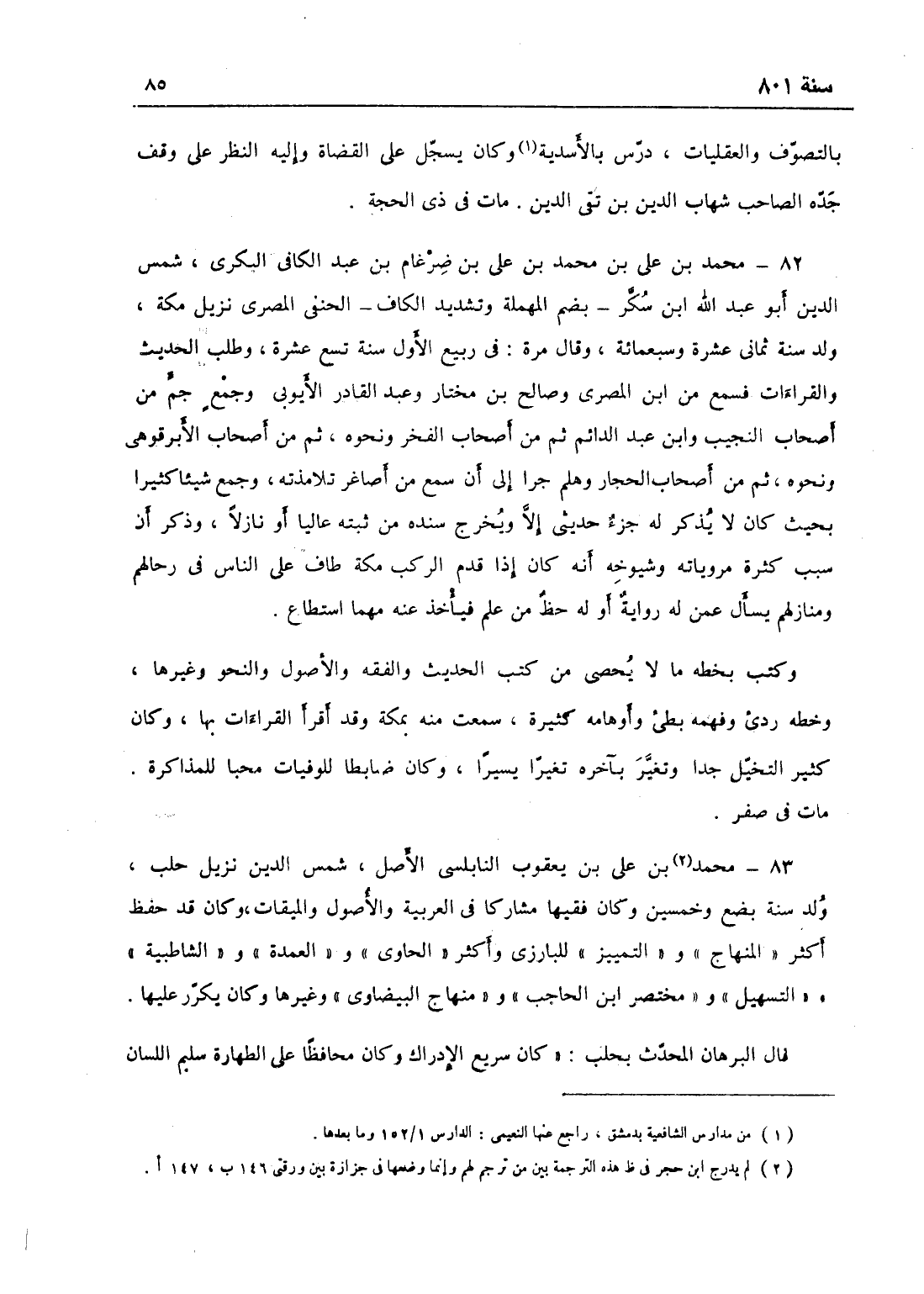 محمد بن علي بن محمد بن علي بن ضرغام بن عبد الكافي البكري شمس الدين أبو عبد الله بن سكر الحنفي المصري نزيل مكة، ولد سنة ثمان عشرة وسبعمائة، وقال مرة: في ربيع الأول سنة تسع عشرة، وطلب الحديث والقراآت فسمع من ابن المصري وصالح بن مختار وعبد القادر الأيوبي وجمع جم من أصحاب النجيب وابن عبد الدائم ثم من أصحاب الفخر ونحوه ثم من أصحاب الأبرقوهي ونحوه ثم من أصحاب الحجار وهلم جرا إلى أن سمع من أصاغر تلامذته وجمع شيئاً كثيراً بحيث كان لا يذكر له جزء حديثي إلا ويخرج سنده من ثبته عالياً أو نازلاً، وذكر لي أن سبب مروياته وشيوخه أنه كان إذا قدم الركب مكة طاف على الناس في رحالهم ومنازلهم يسأل عمن له رواية أو له حظ من علم فيأخذ عنه مهما استطاع، وكتب بخطه ما لا يحصى من كتب الحديث والفقه والأصول والنحو وغيرها، وخطه رديء وفهمه بطيء وأوهامه كثيرة، سمعت منه بمكة وقد قرأ القراآت بها، وكان كثير التخيل وتغير بآخره تغيراً يسيراً، وكان ضابطاً للوفيات محباً للمذاكرة، مات في صفر.