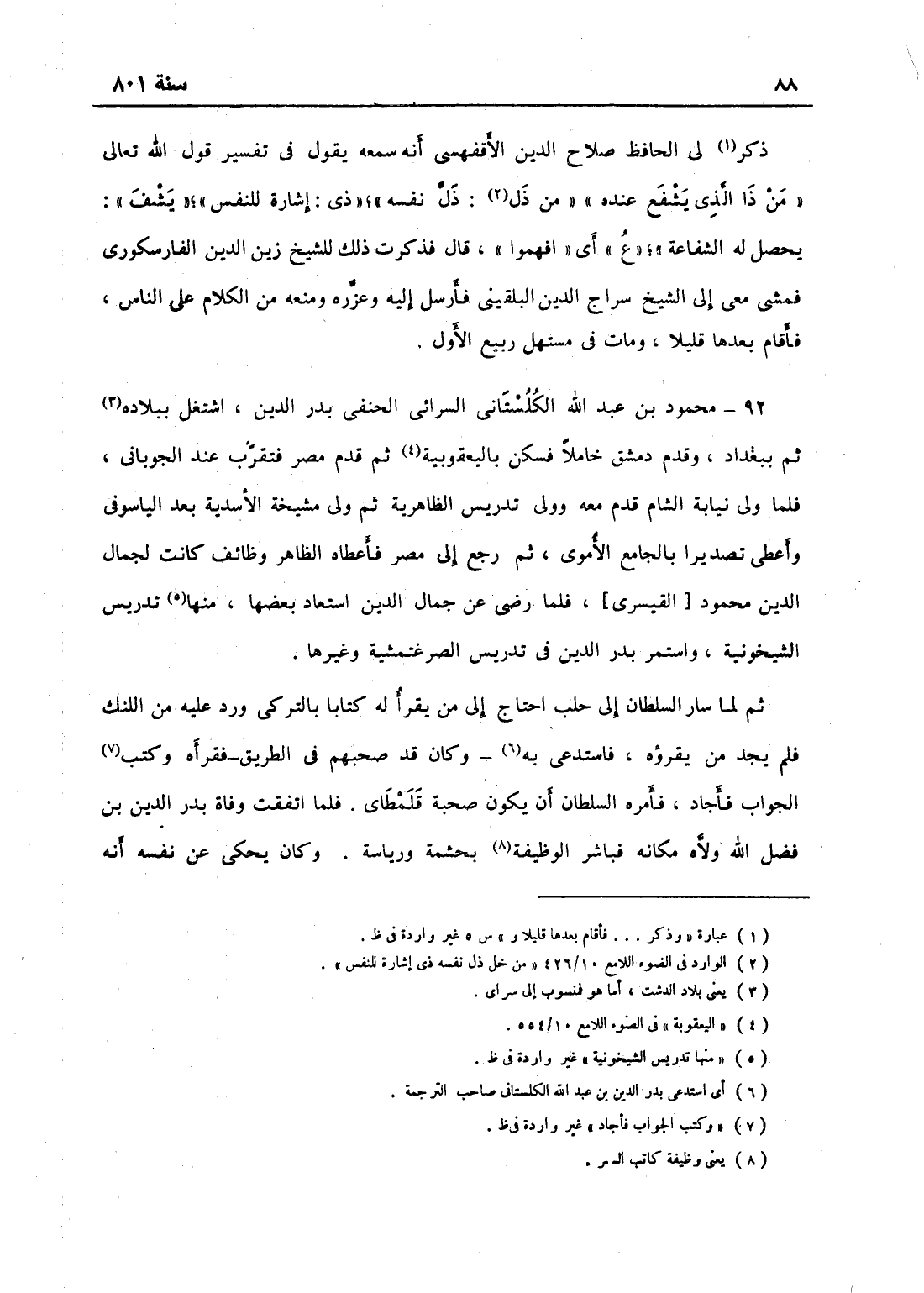 محمود بن عبد الله الكلستاني السيرامي الحنفي بدر الدين اشتغل ببلاده ثم ببغداد وقدم دمشق خاملاً فسكن باليعقوبة ثم قدم مصر فتقرب عند الجوباني فلما ولي نيابة الشام قدم معه وولي تدريس الظاهرية ثم ولي مشيخة الأسدية بعد الياسوفي وأعطي تصديراً بالجامع اأيوبي ثم رجع إلى مصر فأعطاه الظاهر وظائف كانت لجمال الدين محمود القيسري كتدريس الشيخونية والصرغتمشية فلما رضي عن جمال الدين استعاد بعضها منها تدريس الشيخونية واستمر بدر الدين في تدريس الصرغتمشية وغيرها، ثم لما سار السلطان إلى حلب احتاج إلى من يقرأ له كتاباً بالتركي ورد عليه من اللنك فلم يجد من يقرأه فاستدعى به وكان قد صحبهم في الطريق فقرأه وكتب الجواب فأجاد فأمره أن يكون صحبة قلماي الدوادار، فلما اتفقت وفاة بدر الدين بن فضل الله ولاه مكانه فباشر الوظيفة بحشمة ورياسة، وكان يحكي عن نفسه انه