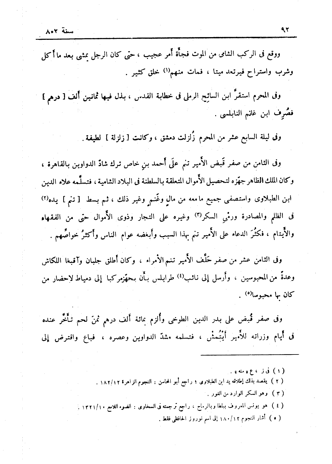 وفي الثاني عشر من صفر حلف الأمير تنم الأمراء وكان أطلق جلبان وآقبغا اللكاش وغيرهما من المحبوسين وأرسل إلى نائب طرابلس بأن يجهز مركباً إلى دمياط لإحضار من بها محبوساً من الأمراء وفي صفر قبض على بدر الدين الطوخي وألزم بمائة ألف درهم ثمن لحم تأخر عنده في أيام وزارته للأمير أيتمش فتسلمه شد الدواوين وعصره فباع وافترض إل