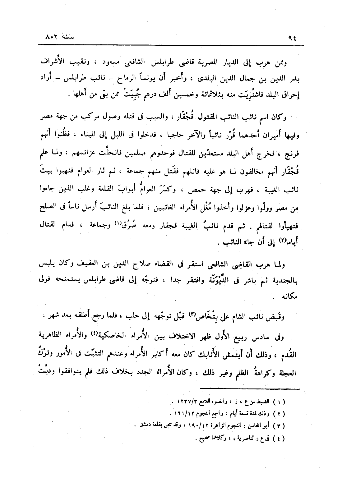 وممن هرب إلى الديار المصرية قاضي طرابلس الشافعي مسعود ونفقيب الأشراف بدر الدين ابن جمال الدين البلدي وأخبرا أن يونس الرماح نائب طرابلس أراد إحراق البلد فاشتريت منه بثلاثمائة وخمسين ألف درهم حبيت ممن بقي بها من أهلها وكان أسم نائب النائب المقتول قجقار، والسبب في قتله وصول مركب من جهة مصر وفيها أميران أحدهما قرر نائباً والآخر حاجباً فدخلوا في الليل إلى المينا وظنوا أنهم فرنج فخرج أهل البلد مستعدين للقتال فوجدوهم مسلمين فانحلت عزائمهم، ولما علم قجقار أنهم مخالفون لما هو عليه قاتلهم فقتل منهم جماعة، ثم ثار العوام فنهبوا بيت نائب الغيبة فهرب إلى جهة حمص وكسر العوام أبواب القلعة وغلب الذين جاءوا من مصر وولوا وعزلوا وأخذوا ثقل الأمراء الغائبين، فلما بلغ النائب أرسل ناساً في الصلح فتهيأوا لقتالهم، ثم قدم نائب الغيبة قجقار ومعه صرق وجماعة فدام القتال أياماً إلى أن جاء النائب، ولما هرب القاضي الشافعي استقر في القضاء صلاح الدين ابن العفيف وكان يلبس بالجندية ثم باشر في الديوانية وافتقر جداً فتوجه إلى قاضي طرابلس يستمنحه، فولي مكانه وقبض نائب الشام على بتخاص قبل توجهه إلى حلب، فلما رجع أطلقه بعد شهر.