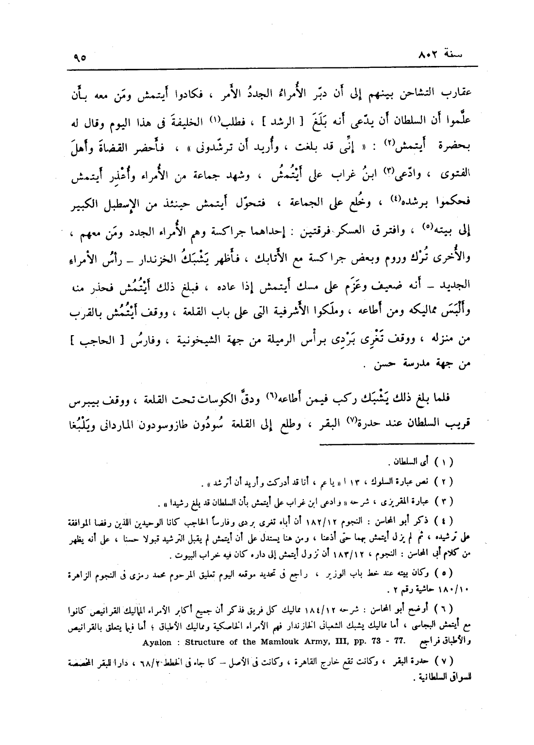 عقارب التشاحن بينهم إلى أن دبر الأمراء الجدد الأمر فكادوا أيتمش ومن معه بأن علموا السلطان أن يدعي أنه بلغ فطلب الخليفة في هذا اليوم وقال له بحضرة أيتمش: إني قد بلغت وأريد أن ترشدني فأحضر القضاة وأهل الفتوى وادعى ابن غراب على أيتمش وشهد جماعة من الأمراء وأعذر أيتمش فحكموا برشده وخلع على الجماعة، فتحول أيتمش حينئذ من الاصطبل الكبير إلى بيته وافترق العسكر فرقتين إحداهما جراكسة وهم الأمراء الجدد ومن معهم، والأخرى ترك وروم وبعض جراكسة مع الأتابك، وأظهر يشبك الخازندار رأس الأمراء الجدد أنه ضعيف وعزم على مسك أيتمش إذا أعاده، فبلغ ذلك أيتمش فحذر منه وألبس مماليكه ومن أطاعه وملكوا الأشرفية التي على باب القلعة وقف أيتمش بالقرب من منزله وقف تغري بردى برأس الرميلة من جهة الشيخونية وفارس من جهة مدرسة حسن، فلما بلغ ذلك يشبك ركب فيمن أطاعه ودقت الكوسات تحت القلعة ووقف بيبرس قريب السلطان عند حدرة البقر وطلع إلى القلعة سودون طاز وسودون المارداني ويلبغا